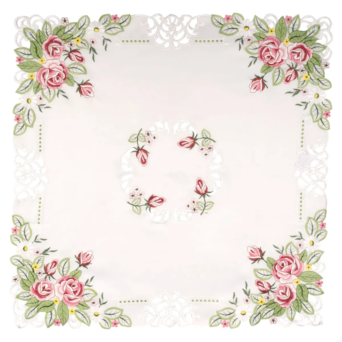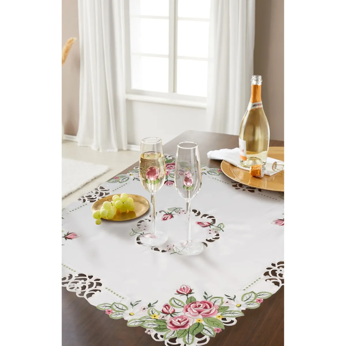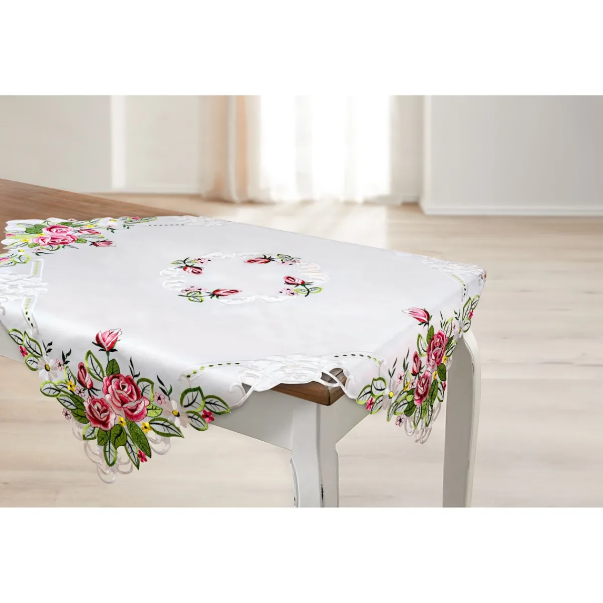 Verleihen Sie Ihrem Tisch mit dieser aparten Mitteldecke eine elegante Note. Verziert mit zarter Spitze und romantischer Rosen-Stickerei, ist sie das perfekte Accessoire für eine stilvolle Tischdekoration.