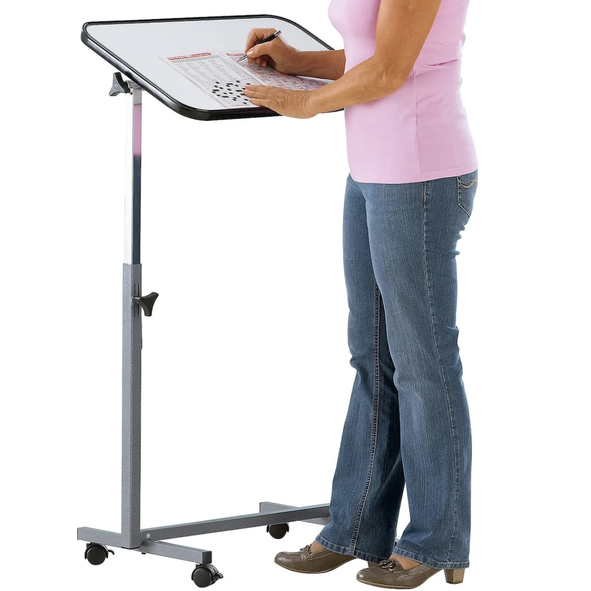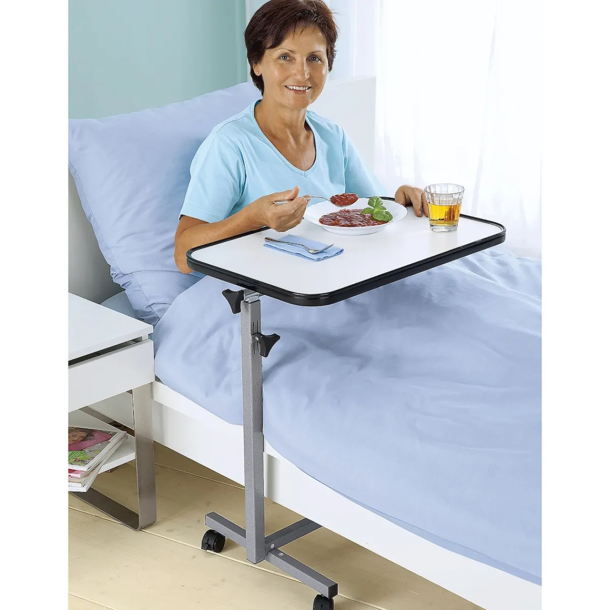 Als rollendes Tablett, mobiler Tisch am Bett, Sofa oder Sessel einsetzbar. Stufenlos höhenverstellbar. Die Tischplatte ist kippbar, die erhöhte Umrandung sorgt dafür, dass nichts herunterrutscht. Belastbar bis 10 kg.