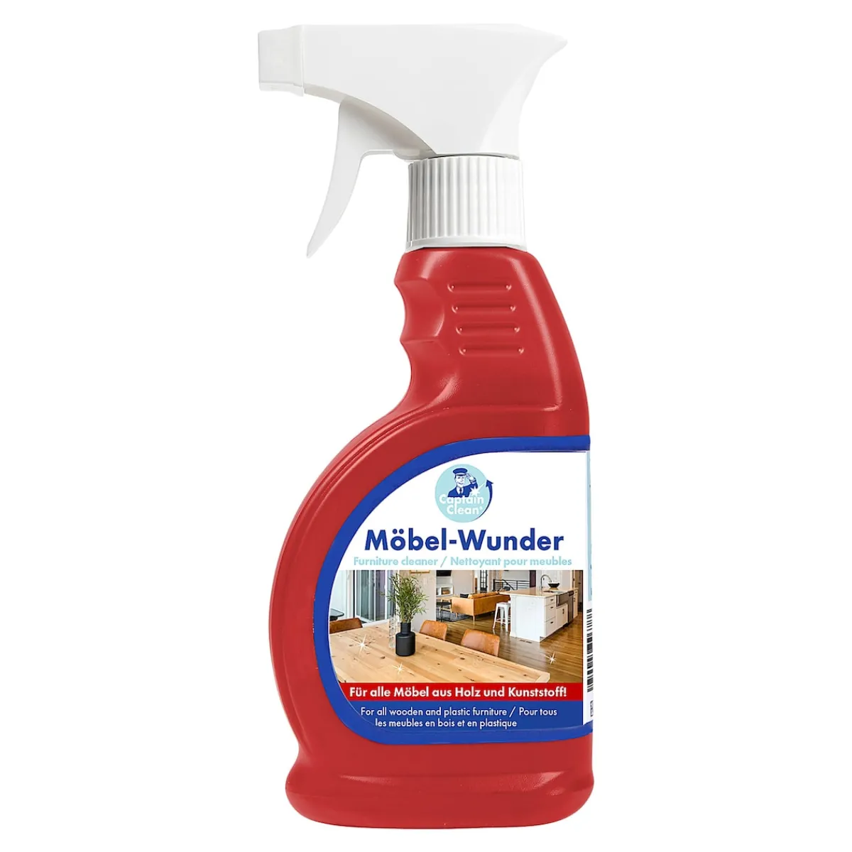 Die sanften Silikonöle im CAPTAIN CLEAN Möbel-Wunder reinigen, pflegen und schützen alte Holzmöbel wirksam vor Staub, ohne lästige Flecken oder Strukturschädigung. Ihr Holz lebt auf und auch Kunststoff- und Ledermöbel werden Ihnen diese Zuwendung danken.