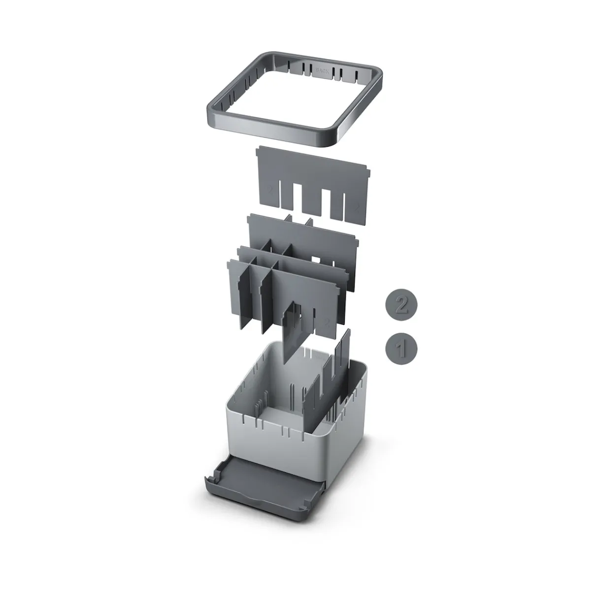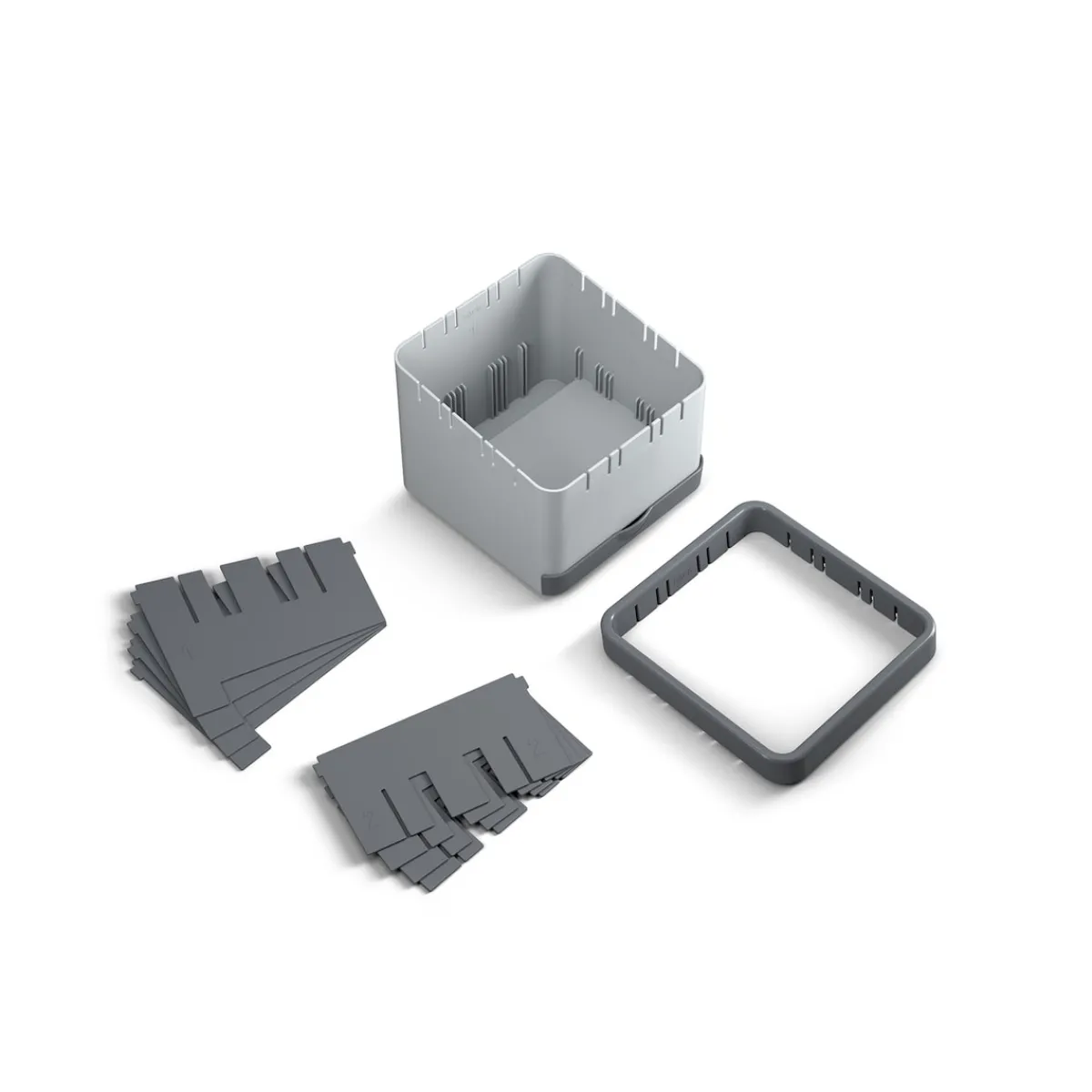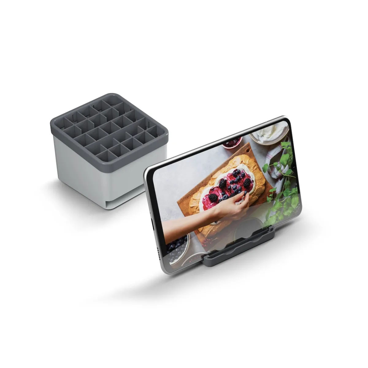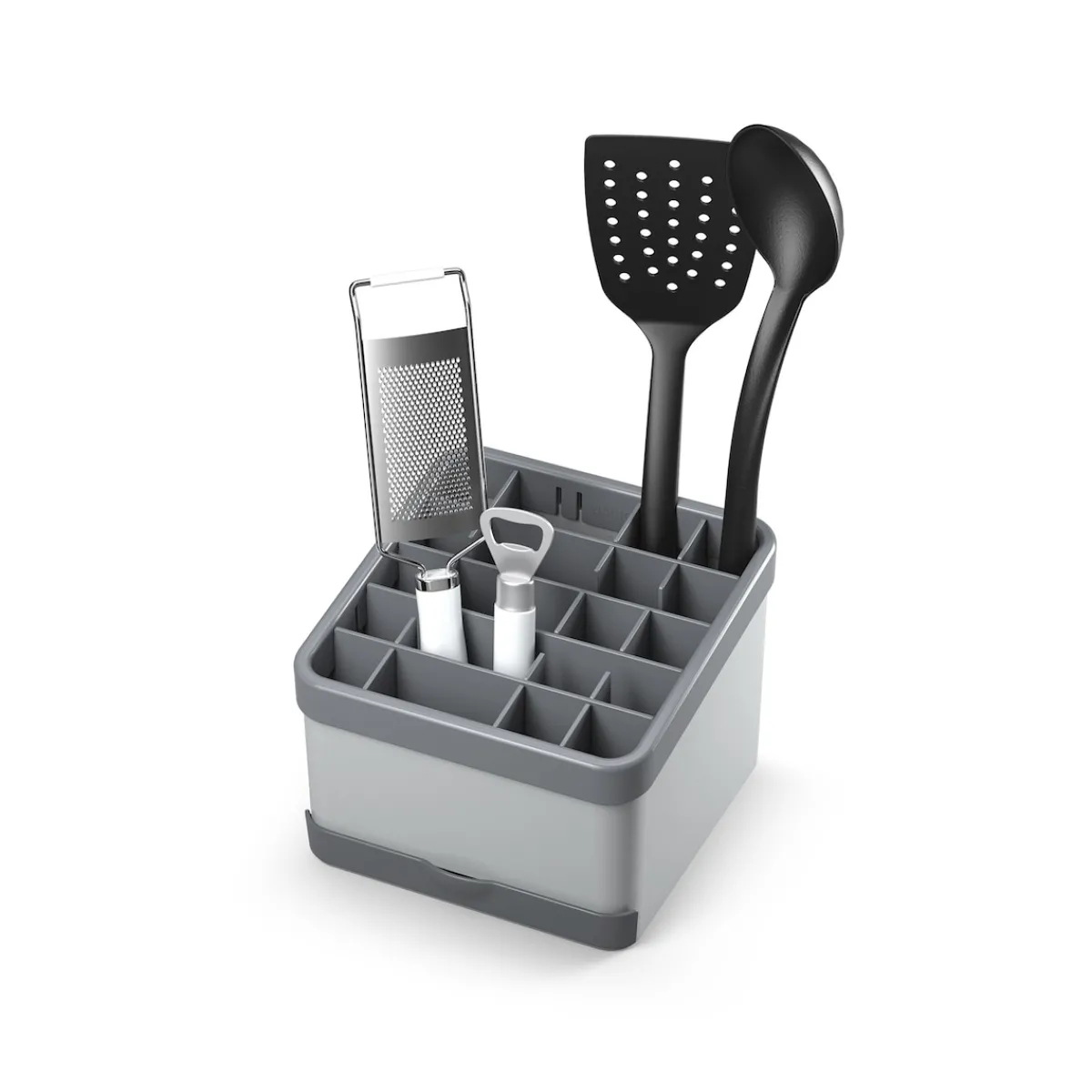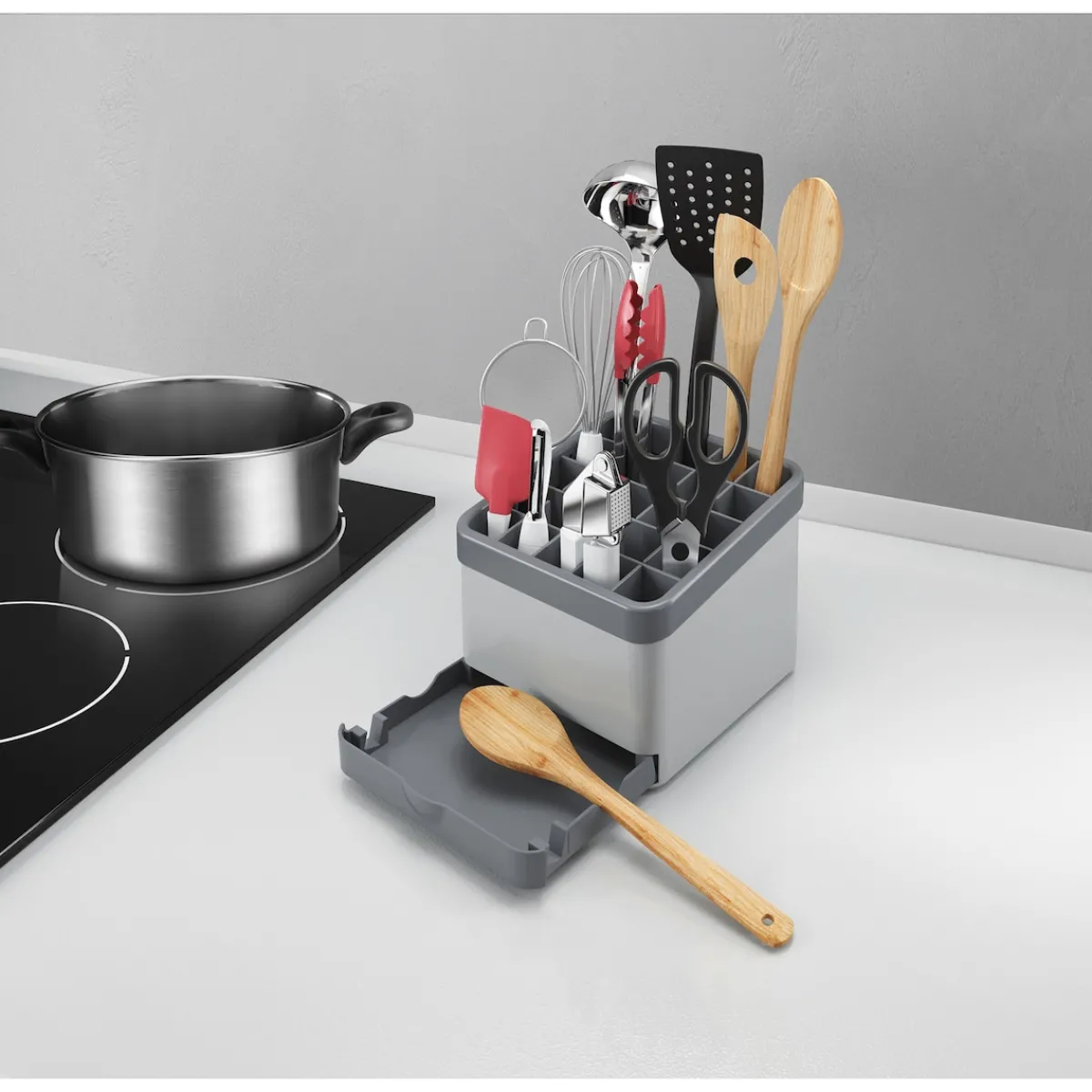 Individuell anpassbarer Organizer für Küchenutensilien mit bis zu 25 Steckplätzen. Mit Schublade als Löffelablage oder Smartphone-/Tablet-Halter.