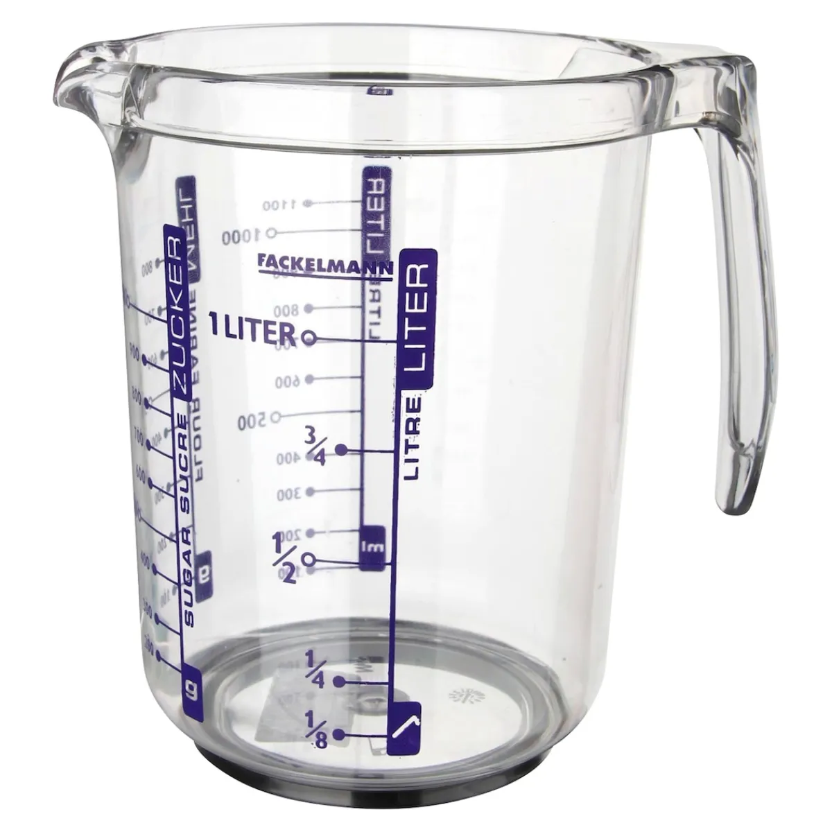 Insgesamt bietet der Becher ein Füllvolumen von 1000 Millilitern (1 Liter). Um die häufigsten Zutaten präzise abmessen zu können, sind für Wasser, Mehl, Zucker und Reis die jeweilig passenden Maßeinheiten (Milliliter, Liter und Gramm) gut lesbar auf den Behälter aufgedruckt. So können Sie beim Abmessen Ihrer Zutaten ganz genau sein.