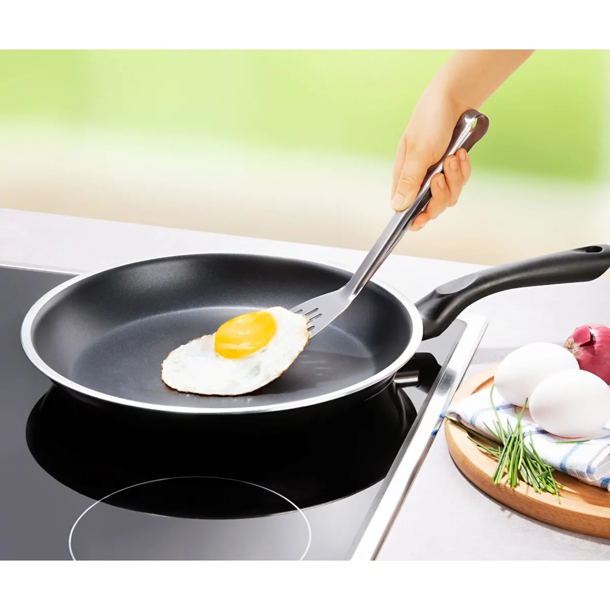 Jetzt gelingen auch schwierige Wendemanöver einwandfrei! Der geniale Pfannenwender dient gleichzeitig als Greifer, so haben Sie Ihr Bratgut immer optimal unter Kontrolle.