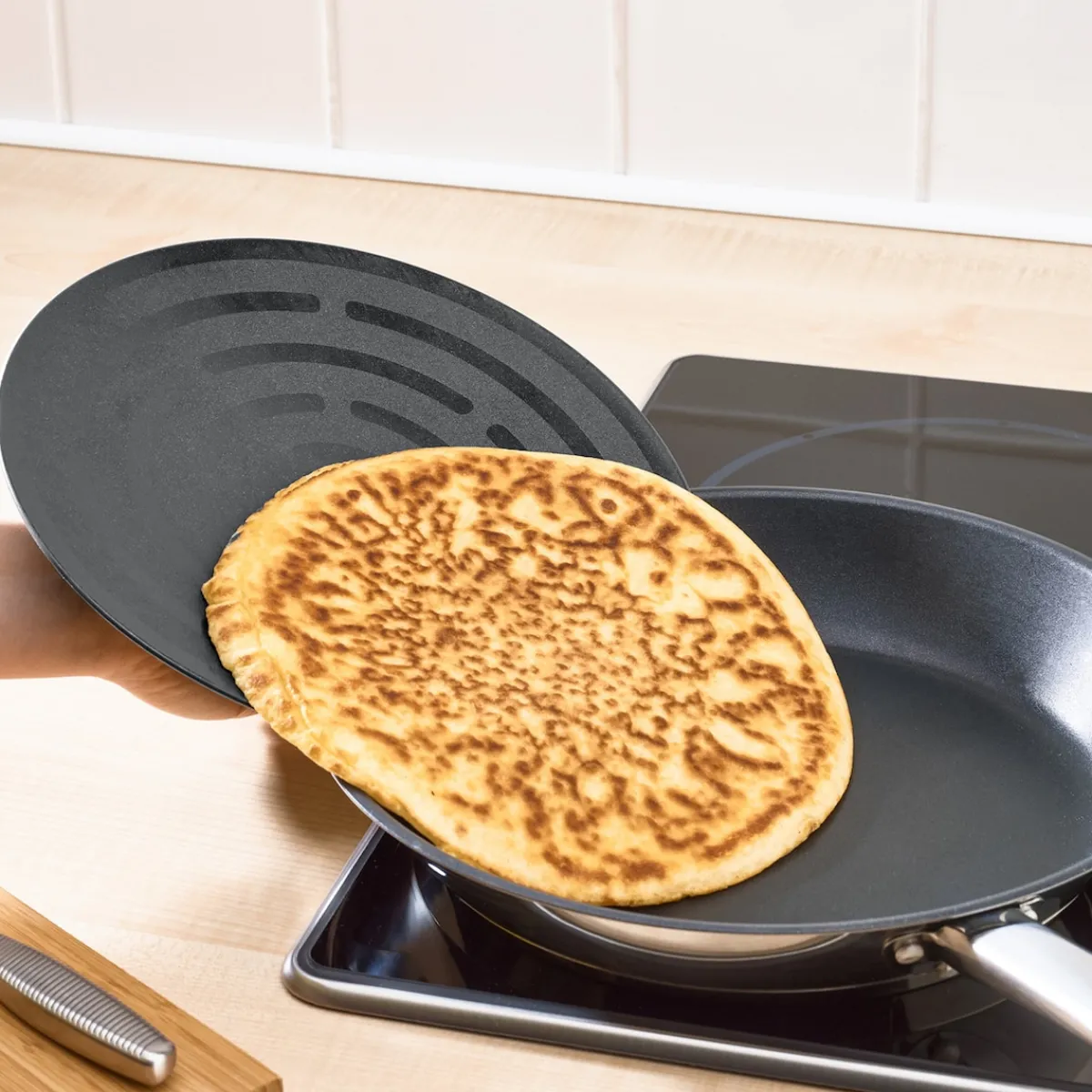 Immer perfekt gewendete Pfannkuchen oder Omelettes – dank dieser ebenso einfachen wie genialen Pfannen-Wendehilfe! Ihre Kreationen schmecken nicht nur köstlich, sondern sehen ab jetzt auch noch perfekt aus! Spülmaschinengeeignet!