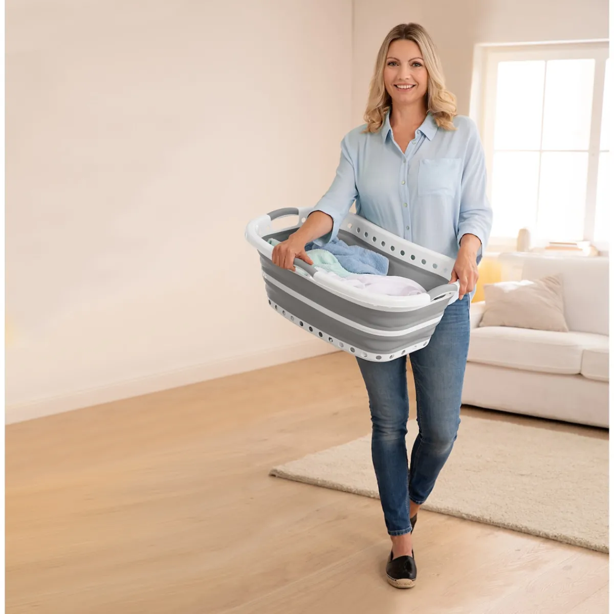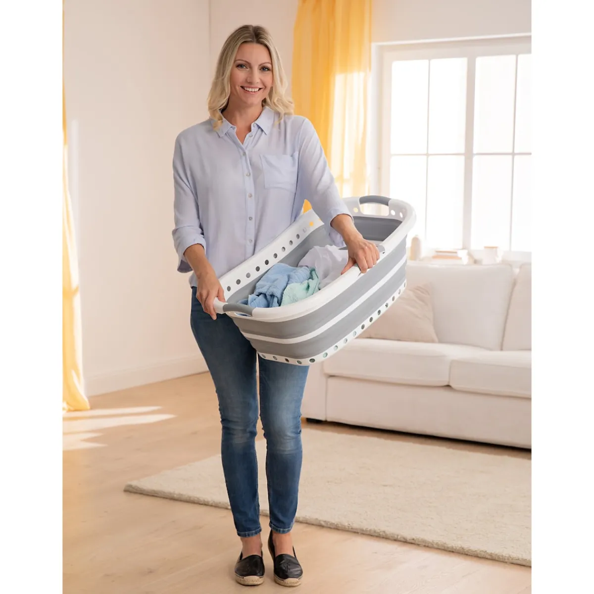 Endlich ein Haushaltshelfer, der sich ganz nach Ihnen richtet! Aufgefaltet bietet der Korb viel Platz für Ihre Wäsche und lässt sich dank seiner 3 Soft-Griffe und der ergonomischen Form wunderbar leicht transportieren. Platzsparend zusammengefaltet ist er auch in kleinen Nischen problemlos verstaubar.