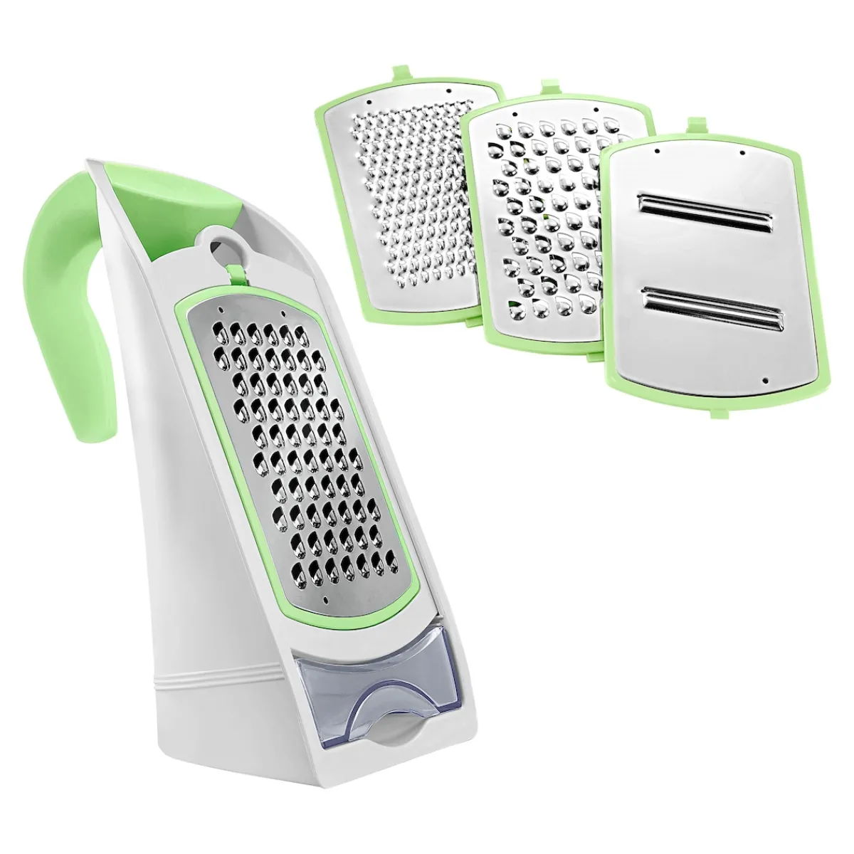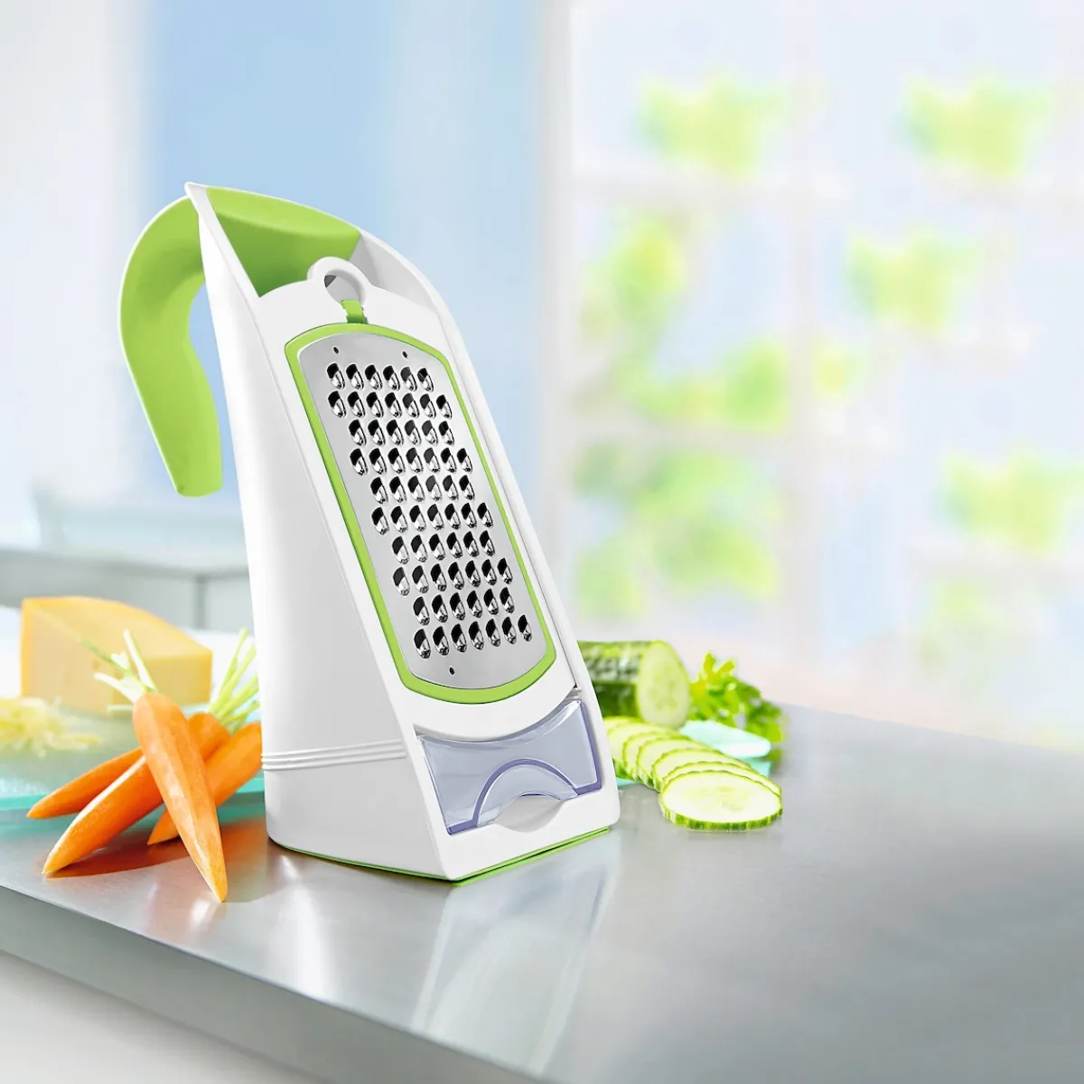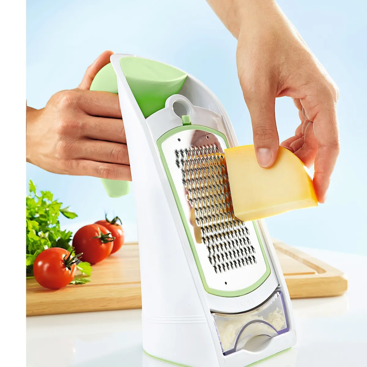 Die Profi-Reibe mit praktischer Auffang-Schublade ist ein wahres Multitalent. Mit 3 unterschiedlichen, auswechselbaren Reibe-Einsätzen für fein Geriebenes, Geraspeltes oder Scheiben – alles landet direkt in der Auffang-Schublade und lässt sich einfach entnehmen. Durch den geformten Griff liegt sie optimal in der Hand und lässt sich sicher halten. Mit rutschfester Unterseite für sicheres Arbeiten.