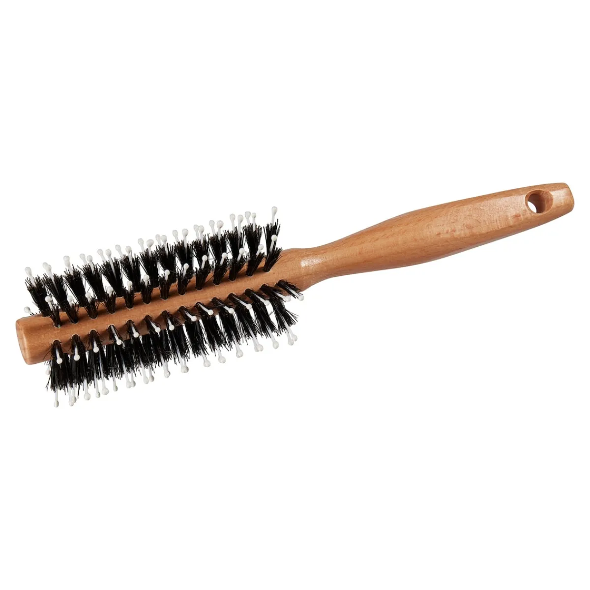 Natürliches Buchenholz mit Wildschweinborsten glätten schonend die Haaroberfläche und sorgen für natürlichen Glanz. Nylon-Stifte mit Noppen massieren zusätzlich die Kopfhaut und sorgen für eine bessere Mikrozirkulation. Mit Aufhänge-Öse.