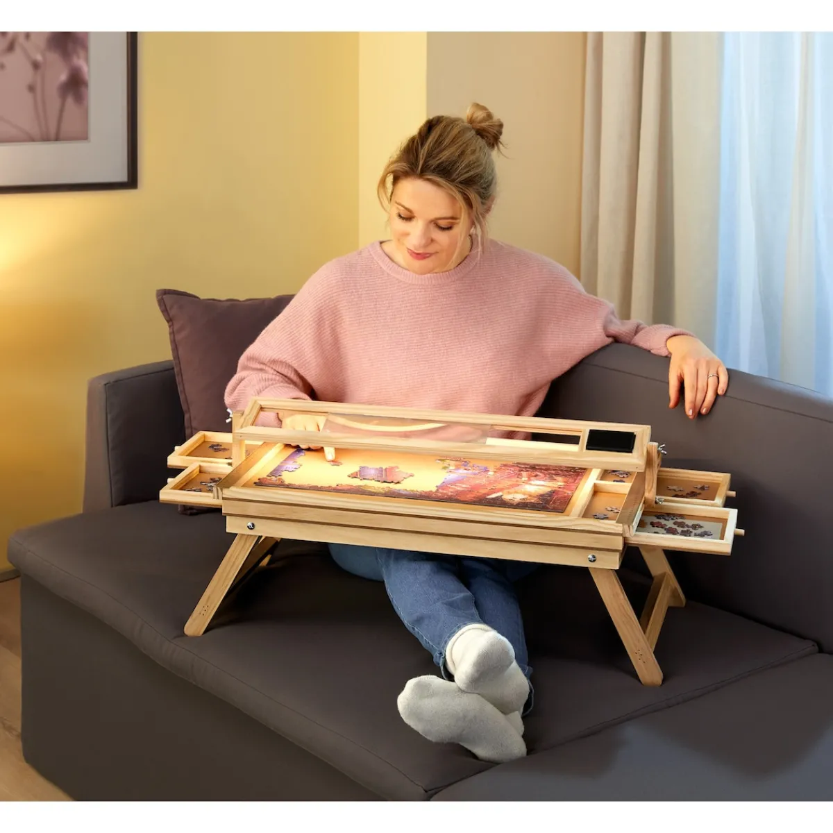 Neben der LED-Leiste und der Lupe bringt der Puzzle-Tisch noch weitere Vorteile mit sich: Er besitzt vier geräumige Schubladen, in denen einzelne Puzzleteile (zum Beispiel bestimmter Formen oder Farben) vorsortiert weden können, um sie später leichter wieder zu finden. Auf dem Tisch können Sie die bisherige Arbeit dauerhaft liegenlassen und falls Sie den Platz brauchen, einfach den ganzen Tisch beiseite stellen. Ist er gerade nicht in Gebrauch lässt er sich zusammenklappen und platzsparend verstauen, bis er wieder zum Einsatz kommt.