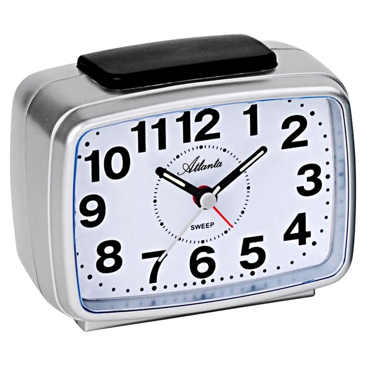Weckruf mit Crescendo und Wiederholung. Beleuchtung auf Tastendruck, fluoreszierende Zeiger. Der „schleichende“ Sekundenzeiger funktioniert ohne Ticken – das garantiert eine ungestörte Nachtruhe.