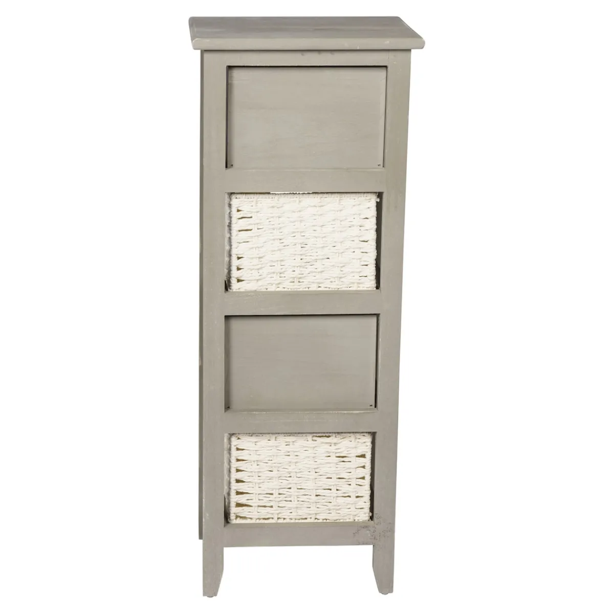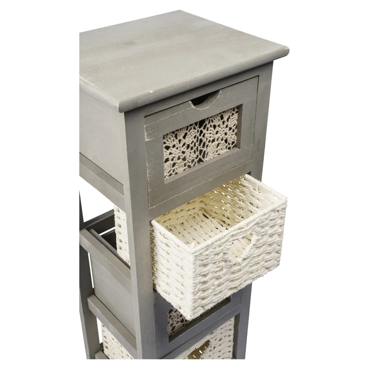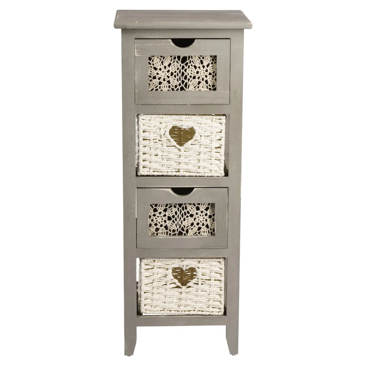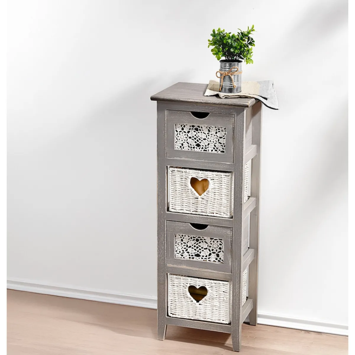Hand aufs Herz: Wer räumt schon gerne auf? Das Aufräumen erledigt sich jedoch fast von alleine, wenn dabei ein Ordnungshelfer wie dieses hübsche Regal beteiligt ist. Tatsächlich wirkt eine aufgeräumte Wohnung in der Regel sauberer und gemütlicher und wir fühlen uns hier automatisch wohler. Seine vier Schubfächer im romantisch-verspielten Design bieten zusätzlichen Stauraum für alles, was Sie ordentlich aufbewahren möchten und wofür Sie sonst nie genügend Platz hatten. Ob im Flur, im Wohnzimmer, Schlafzimmer oder Kinderzimmer – das Regal ist praktisch in jedem Raum einsetzbar und macht überall eine gute Figur. Zwei der Schubfächer sind Holzkisten, die an der Front einen Ausschnitt mit hübschem Häkelmuster zeigen. Bei den anderen beiden Schubfächern handelt es sich um Körbchen in Weideoptik mit ausgestanztem Herz. Die Farben Beige und Grau harmonieren hier perfekt und vermitteln zusammen ein romantisch-gemütliches Ambiente, das zum Wohlfühlen einlädt.