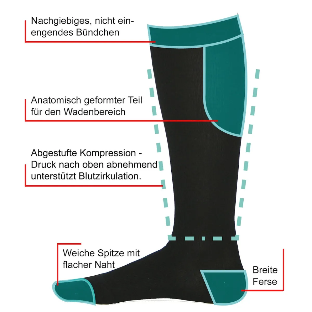 Hilft als Prophylaxe gegen Reisethromboseerzeugen von außen Druck auf die erweiterten Venen, damit die Venenklappen besser schließen weicher Bund, kein Einschneiden als Prophylaxe gegen Reisethrombose ideal bei mangelnder Bewegung oder langem Sitzen, z.B. im Flugzeug, Zug oder Auto Pflegeleichte Qualität Weicher Abschlussrand, bequemer Halt ohne Einschnüren Gute Hautverträglichkeit Faltenfreier und rutschsicherer Sitz durch den Einsatz hochwertiger Materialien – auch nach häufigem Waschen In 4 Größen erhältlich Bei 30° waschbar