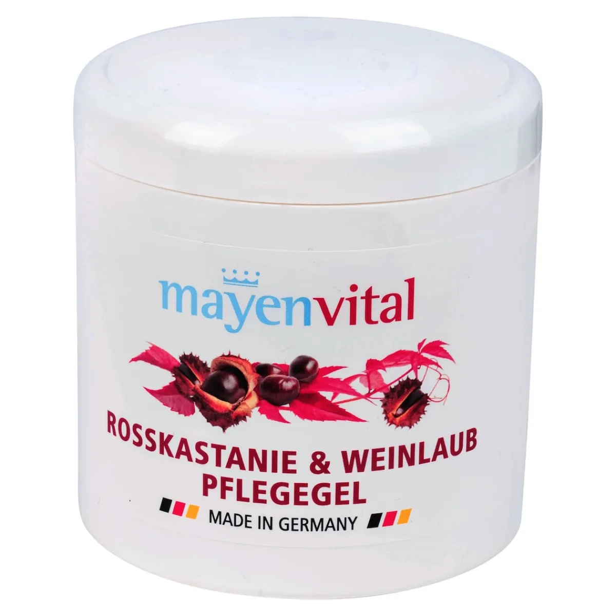 Extrakte aus dem getrockneten Samen der Rosskastanie wirken in vieler Hinsicht positiv auf die Blutgefäße. Sie dichten die Gefäßwände ab und verhindern den Austritt von Flüssigkeit aus den Gefäßen. Sie steigern die Spannkraft der Venen, die für den Rückfluss des Blutes aus den Beinen in das Herz notwendig sind. Das Rosskastanie & Weinlaub Pflege-Gel hilft Schwellungen in den Beinen, Juckreiz, Spannungsgefühl in den Waden, nächtliche Wadenkrämpfe, Krampfadern und schwere, schmerzende und müde Beine zu bekämpfen. Der Rosskastanie wird eine entzündungshemmende Wirkung zugeschrieben. Auch das rote Weinlaub wirkt sich positiv auf die Venenfunktion aus. Dafür sind die enthaltenen Flavonoide verantwortlich. Neben einer entzündungshemmenden Wirkung können sie Gefäßwände abdichten und verhindern, dass Wasser in das Gewebe eindringt. Dadurch kann das rote Weinlaub Beschwerden wie angeschwollene Knöchel oder müde Beine lindern. Das Rosskastanie & Weinlaub Pflege-Gel ist kein Arzneimittel. Es darf grundsätzlich nur bei leichten Beschwerden angewendet werden. Ein Arzt sollte im Vorfeld die Symptome abklären.