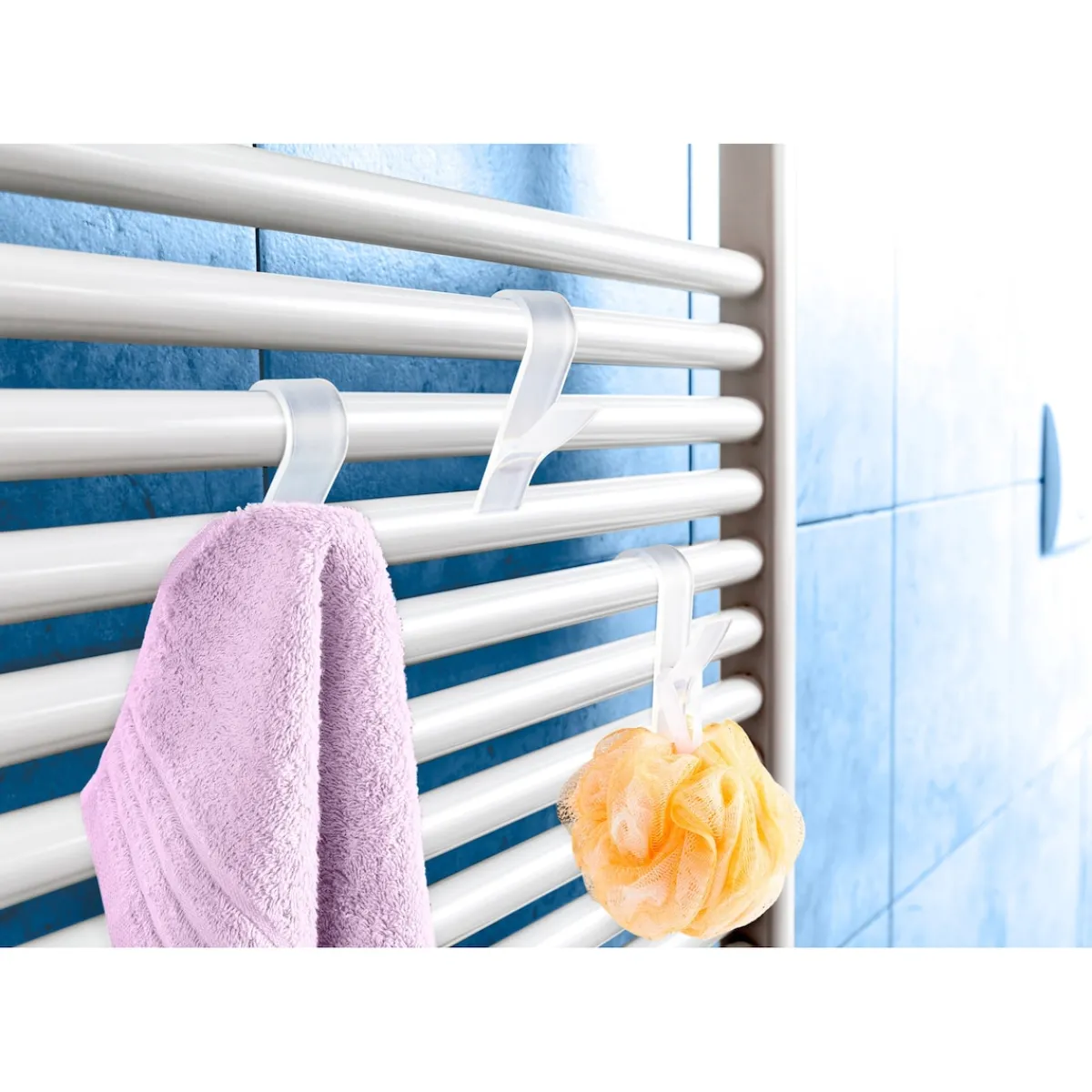 Und schon wieder eine gute Idee: Bestücken Sie einfach Ihren Handtuch-Trockner mit den Rundheizkörper-Haken, schon gibts viel neuen Platz für Waschlappen, Bademäntel etc.
