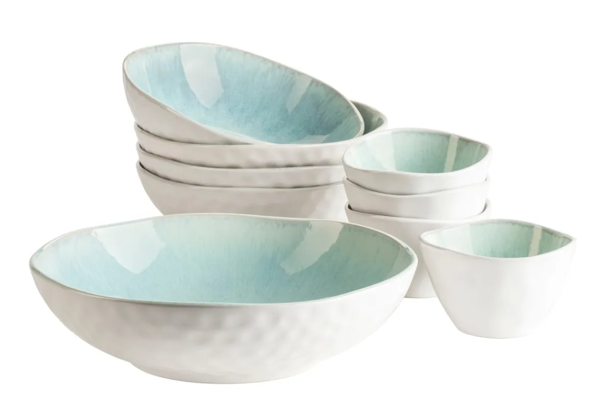 Die österreichische Traditionsmarke MÄSER greift mit der modernen Vintage-Kollektion „Frozen“ den stilvollen skandinavischen Wohlfühltrend auf und zeigt, wie bezaubernd Keramikgeschirr verarbeitet sein kann. Die mattweiße Außenglasur weist eine ganz besondere Haptik auf und versprüht Wärme und Gemütlichkeit in Ihrem Zuhause. Ein echter Hingucker ist die innen bzw. oben von Hand gesprenkelte Glasur, die jedes Teil zu einem Unikat macht. Dieses Set aus 9 Schüsseln und Schälchen ist perfekt kombinierbar mit anderen Artikeln der Tafelgeschirr-Kollektion Frozen von MÄSER.