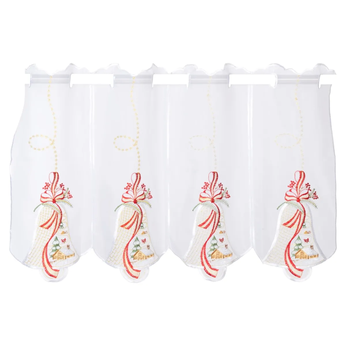 Zarte, goldfarbene Glitzerfäden, Glocken und rote Schleifen auf dieser Gardine machen jedes Fenster zum festlichen Blickfang.