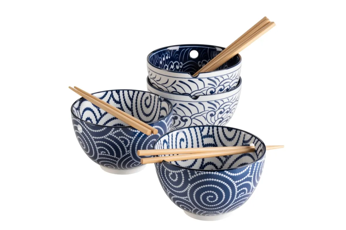 Holen Sie sich asiatischen Lifestyle nachhause und erleben Sie authentischen Genuss mit diesen Schüsseln aus der Serie „Jurka“, von der österreichischen Marke Mäser. Egal ob für Ramen, Pho, Suppe, Reis oder Nudel Bowls – die praktischen Porzellan Schalen sind perfekt für Liebhaber der asiatischen Küche. Besonders die raffinierte Halterung für Essstäbchen werden Asia Food Fans begeistern. Die blau-weißen Muster sind inspiriert von der traditionellen japanischen Stickkunst und verleihen ihrem Zuhause im Nu einen fernöstlichen Touch.