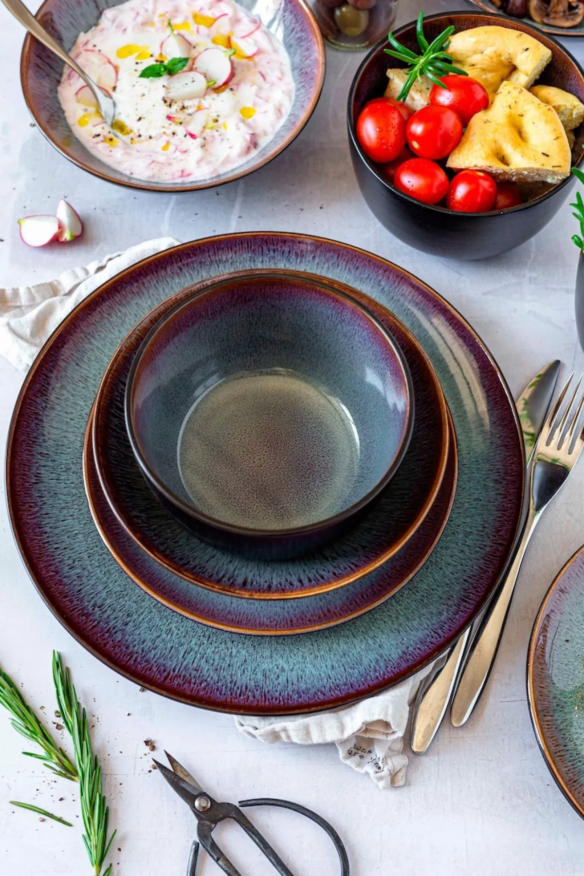 Die wunderschön leuchtenden Naturfarbtöne von Grün-Blau bis Rot-Braun bilden den perfekten Kontrast zur semimatt schwarzen Außenglasur. Die Farben fließen auf jedem Teil der Kollektion „Teona“ auf unterschiedliche Weise ineinander, so dass jeder Teller, jede Schale und jeder Kaffeebecher ein einzigartiges Farbmuster aufweisen. Die besondere Glasur, die die österreichische Traditionsmarke MÄSER für diese Kollektion verwendet, schimmert je nach Lichteinfall in verschiedenen Nuancen. Gefertigt aus hochwertigem Steinzeug (nicht zu verwechseln mit dem deutlich brüchigeren Steingut) ist die Keramikgeschirr Serie „Teona“ trotz ihrer außergewöhnlich Optik mikrowellen- und spülmaschinengeeignet und damit absolut alltagstauglich.