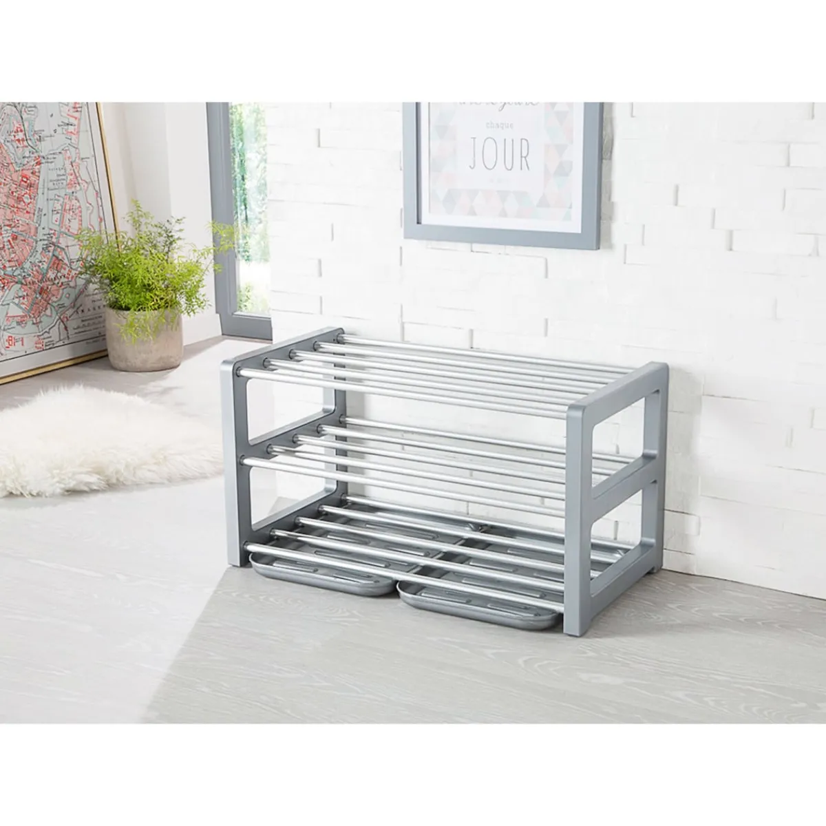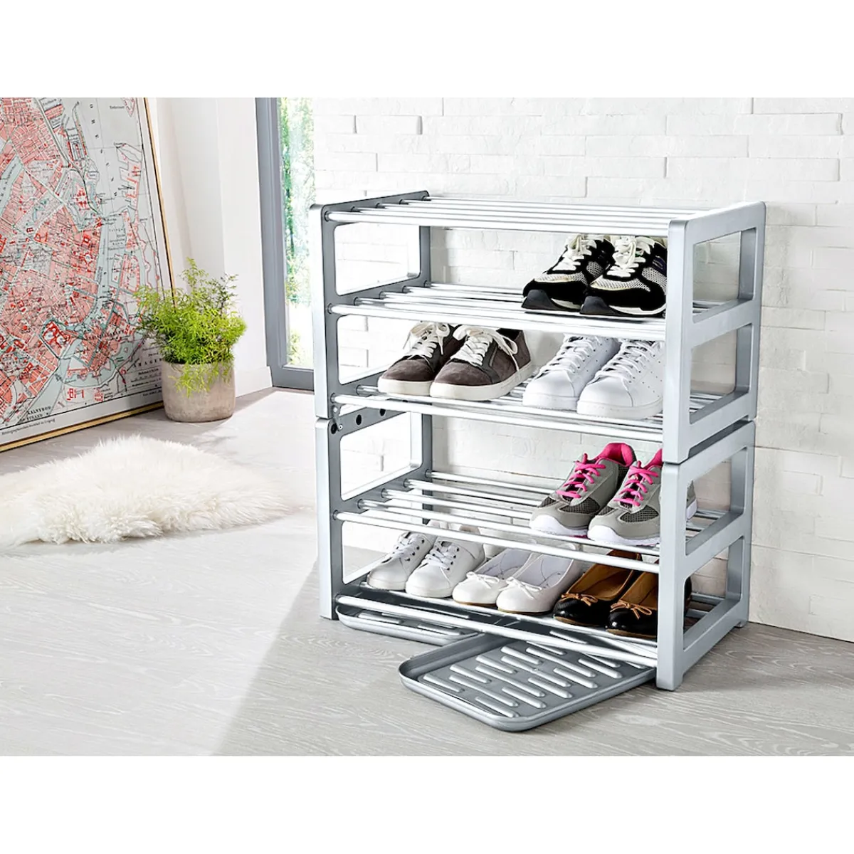 Vereint Design und Funktionalität. Mit 3 Gitter-Böden zum platzsparenden Verstauen Ihrer Schuhe. Stapelbar.