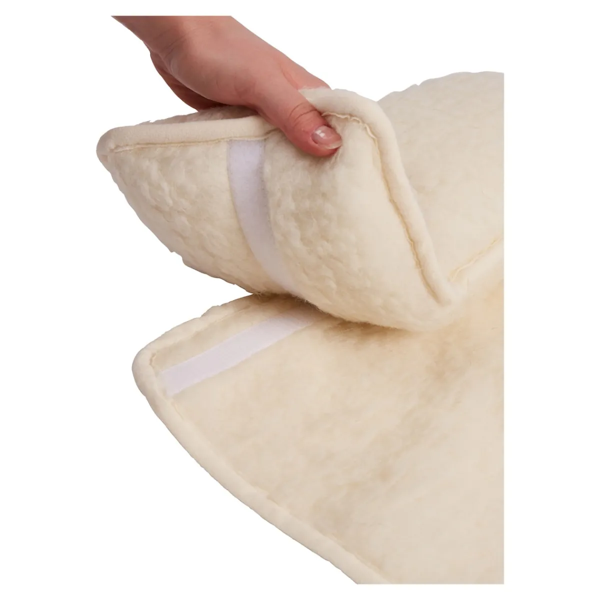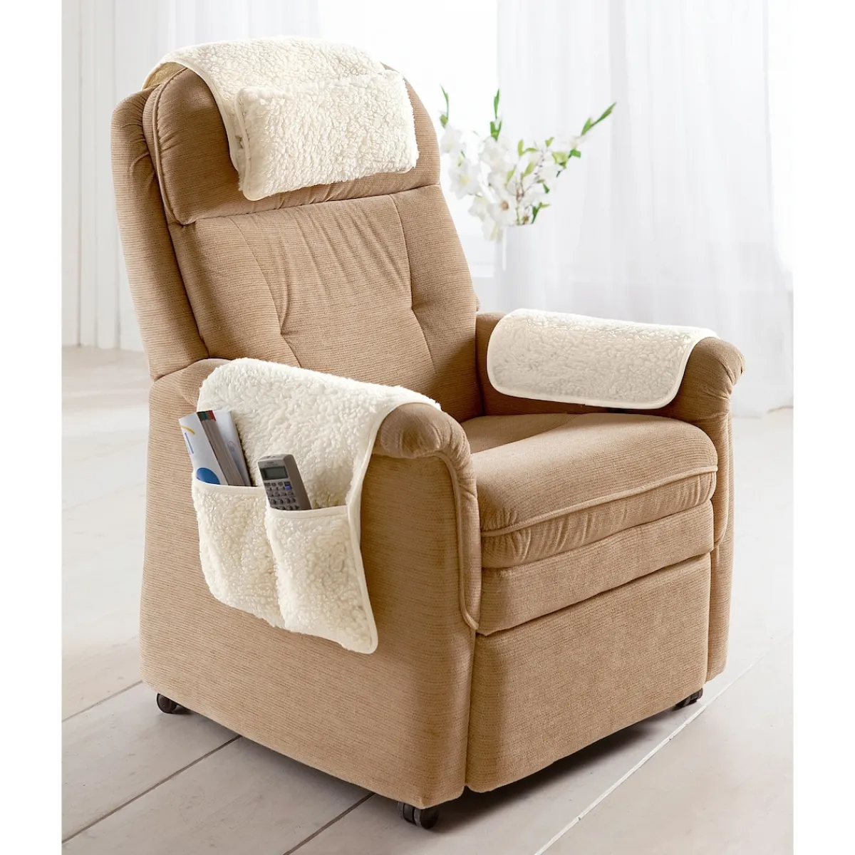 Schurwolle sorgt für einen angenehmen Klima-Ausgleich – ganz ohne Hitzestau! Auf diesen Sesselschonern werden Sie sich richtig wohlfühlen und nie mehr frieren. 4 seitliche Taschen runden den Komfort ab. Nackenkissen mit Schleppe, 2 Armlehnenschoner: (LxB) 60×40 cm.