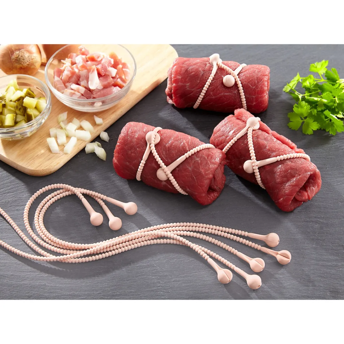 Optimal, um Rouladen oder Krautwickel zuzubereiten: Die dehnbare Schnur wird herumgewickelt und das Ende durch die Öse gesteckt. Immer wieder verwendbar! Spülmaschinengeeignet und hitzebeständig bis +230 °C.