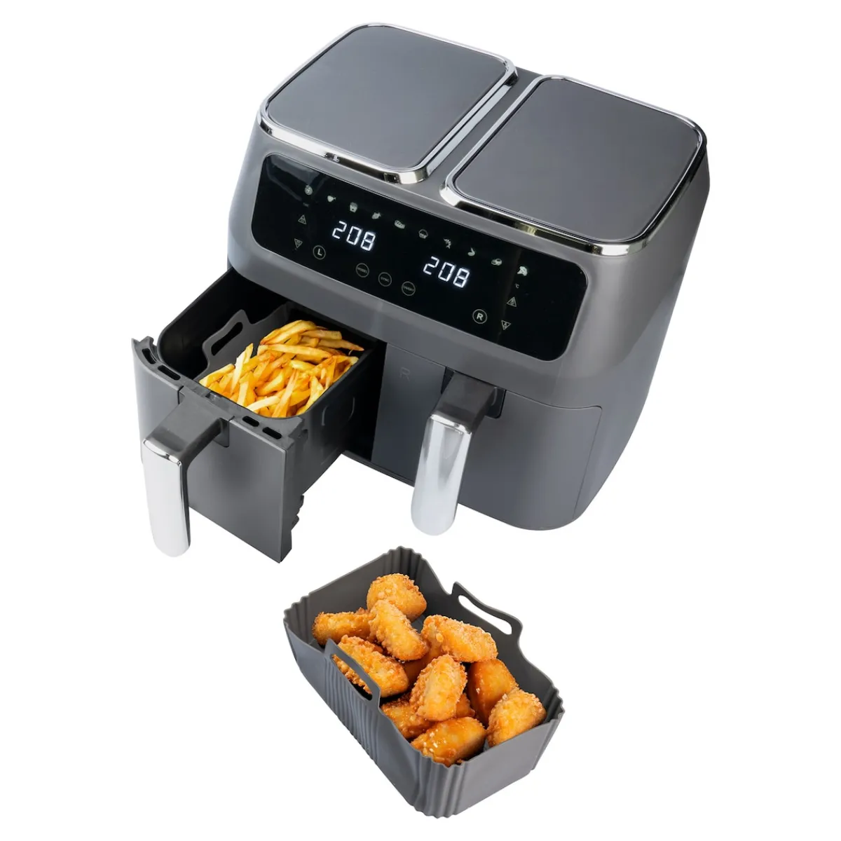 Die stabile Silikon-Schale für Doppelfritteusen ist auch perfekt geeignet, um ruck, zuck einen kleinen Kuchen zu zaubern! Schön, dass nun auch das mühevolle Reinigen der Fritteuse entfällt und Sie mehr Zeit für Ihre Gäste haben.