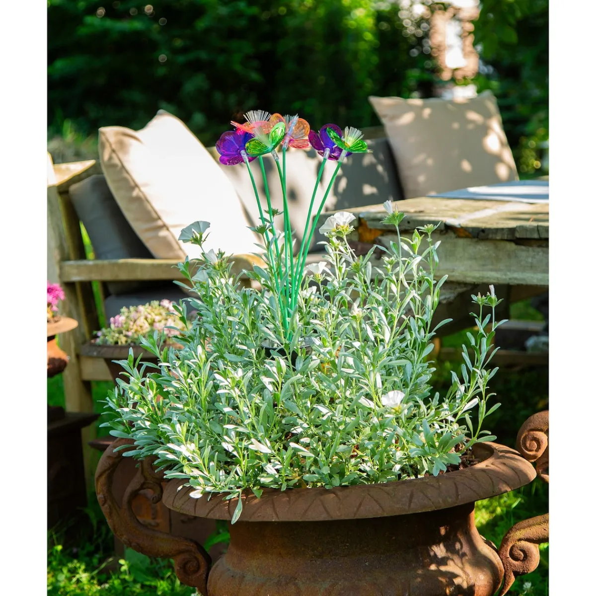 Die filigranen Blüten und leuchtenden Fasern dieses Blumensteckers entfalten bei Nacht ein bezauberndes Lichtspiel. Unzählige Lichtpunkte „tanzen“ sanft im Dunkeln und verleihen Ihrem Außenbereich eine märchenhafte Atmosphäre – ganz ohne Strom.