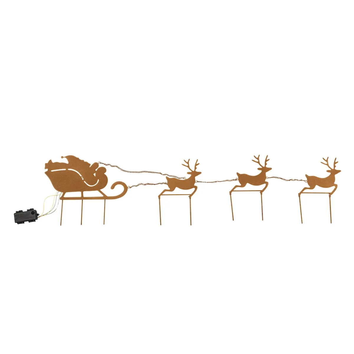 Bringen Sie festlichen Glanz in Ihren Garten! Der LED-Gartenstecker zeigt den Weihnachtsmann im Schlitten, gezogen von drei Rentieren. Die LEDs tauchen das Motiv in stimmungsvolles Licht, während das rostfarbene Design perfekt in die winterliche Natur passt. Ein echter Hingucker für Ihre Außen-Deko!