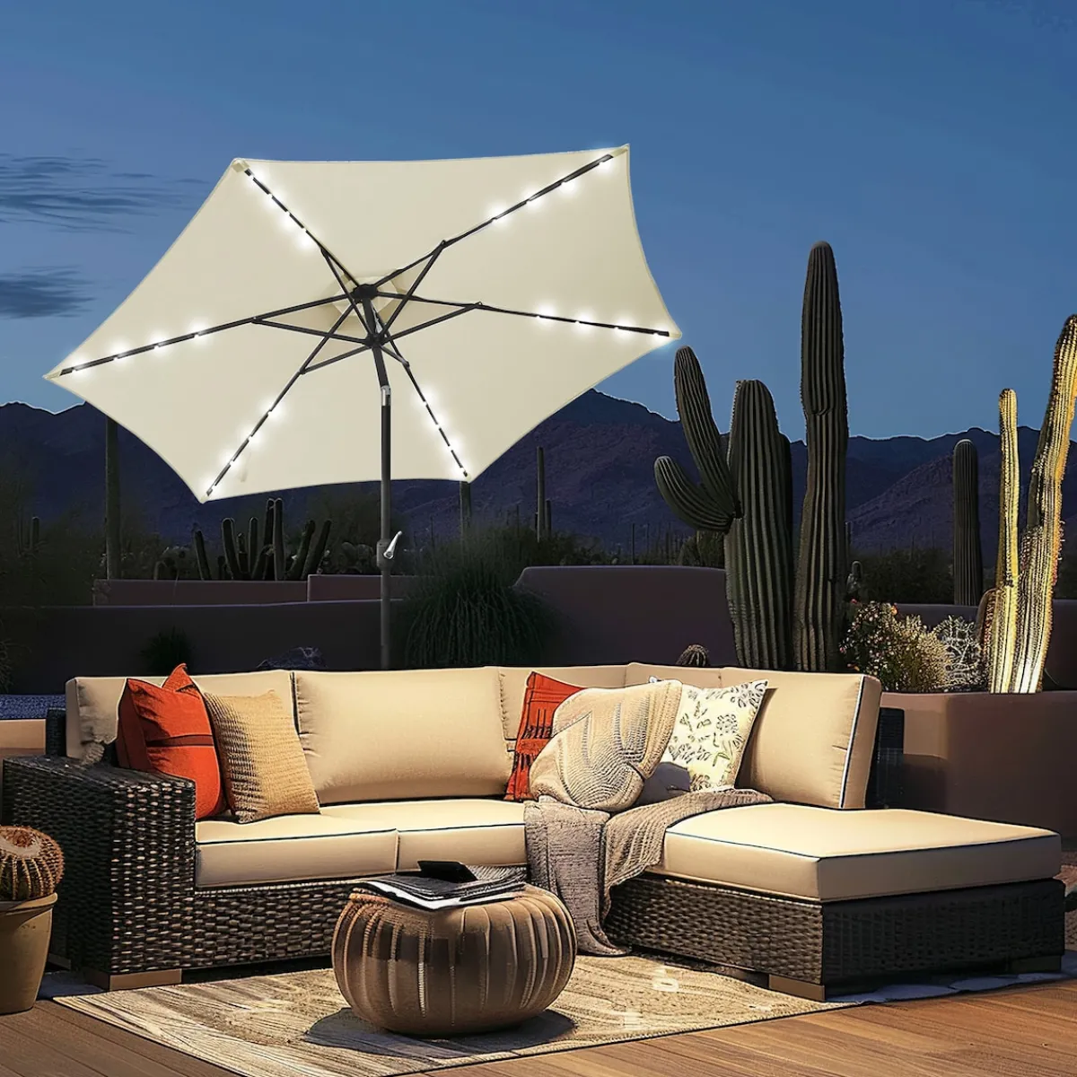 Mit dem Solar-Sonnenschirm „Sternenhimmel“ erleben Sie Sommerabende in Ihrem Garten oder auf dem Balkon noch angenehmer. Dank seines großzügigen Durchmessers von 2,7 m und UV-Faktor 50+ spendet er großzügigen Schatten, während die integrierte Solarbeleuchtung mit warmweißen LEDs eine stimmungsvolle Atmosphäre schafft. Die praktische Handkurbel ermöglicht ein einfaches Öffnen und Schließen, während der hochwertige Polyesterbezug mit UV50+ Schutz für Langlebigkeit sorgt. Mit der Dimmfunktion können Sie die Helligkeit nach Ihren Wünschen anpassen und gemütliche Abende im Freien verlängern.