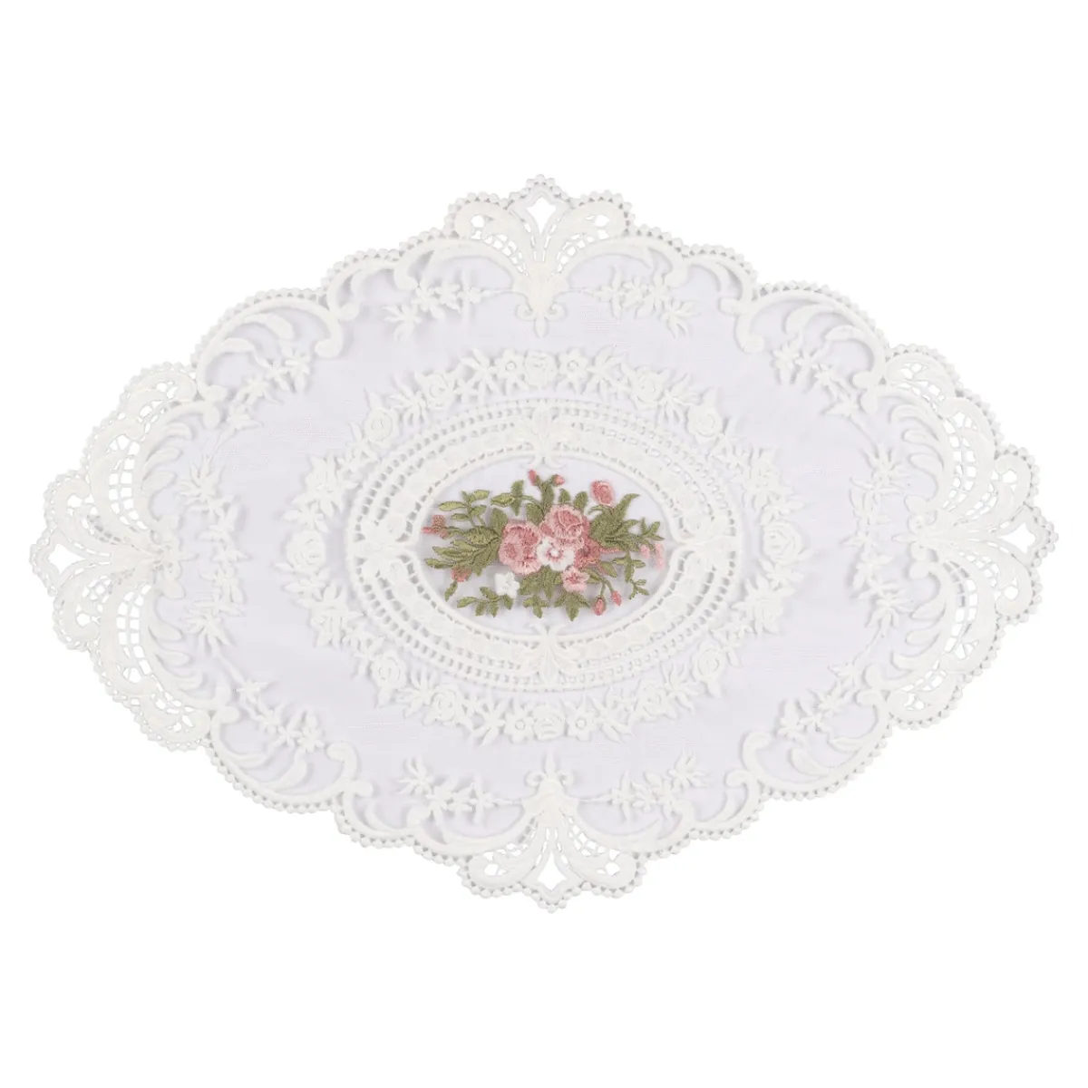 Bringen Sie klassischen Charme in Ihr Zuhause: Dieses ovale Spitzendeckchen beeindruckt mit filigraner Rosenstickerei und fein gearbeiteter Spitzenborte. Der edle Look verleiht Tischen und Kommoden eine nostalgische, fast königliche Ausstrahlung – perfekt, um Akzente zu setzen oder geliebte Stücke stilvoll in Szene zu setzen.
