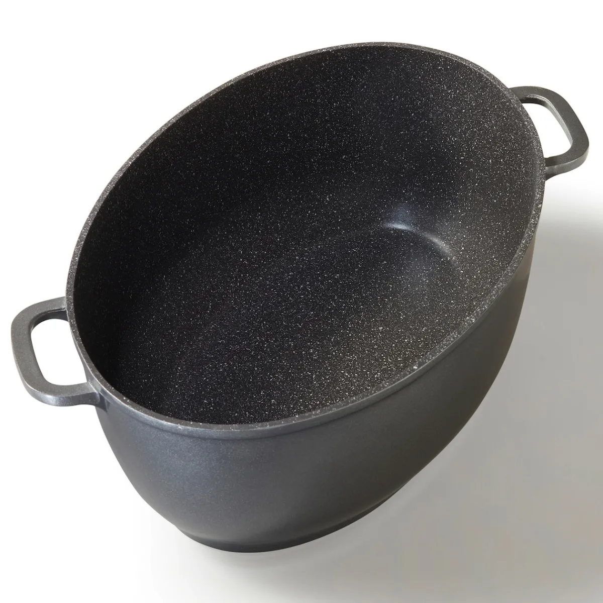 STONELINE – Das Original!Gesund fettfrei kochen und braten! Der ovale Gourmet-Bräter vereint unschlagbare Funktionalität mit zeitlosem Design. Ganz gleich, ob Sie das Kochgeschirr auf dem Herd oder im Backofen verwenden: darin gelingen Ihnen jegliche Gerichte. Der Glasdeckel mit Aroma-Funktion ist eine weitere Zusatzfunktion, die den Bräter zu einem unverzichtbaren Kochgeschirr in Ihrer Küche macht.Fügen Sie über den Aroma-Griff im Glasdeckel Flüssigkeiten wie Wein, flüssige Gewürze oder eine deftige Brühe Ihrem Essen zu. 1 Gourmet-Bräter, ca. 38,8 x 26,3 cm, Höhe: ca. 12,9 cm, ca. 8 l1 Aroma-Glasdeckel, ca. 38,8 x 26,3 cm Die wichtigsten Vorteile des STONELINE Kochgeschirrs auf einen Blick: Weltweit einzige Antihaftbeschichtung mit echten Steinpartikeln Kratzfeste STONELINE-Antihaftbeschichtung Vitaminschonend kochen und braten ohne Fett und Öl Optimales Bratergebnis und kross gebratenes Fleisch Auch für Vegetarier geeignet: Gemüse bleibt knackig und saftig Kein Anbrennen und kein Ankleben Super leicht zu reinigen Extra starker, verzugsfreier Boden Bodenstärke: 4,5 mm Für alle Herdarten geeignet, auch Induktion Backofengeeignet bis 220 °C (ohne Deckel) / 180 °C (mit Deckel) Material: Aluminiumguss Reinigungs- und Pflegetipps: Vor dem ersten Gebrauch empfehlen wir, Ihr Koch- oder Backgeschirr mit etwas Wasser und einem milden Spülmittel gründlich auszuwaschen.Verteilen Sie anschließend mit einem Papierküchentuch einige Tropfen Speiseöl auf der Beschichtung.Bei der weiteren Nutzung können Sie auf den Einsatz von Fett oder Öl verzichten!Dank dem Easy-Clean-Effekt wird die Reinigung per Hand empfohlen. Einfach mit heißem Wasser, Handspülmittel und einem weichen Schwamm auswischen.