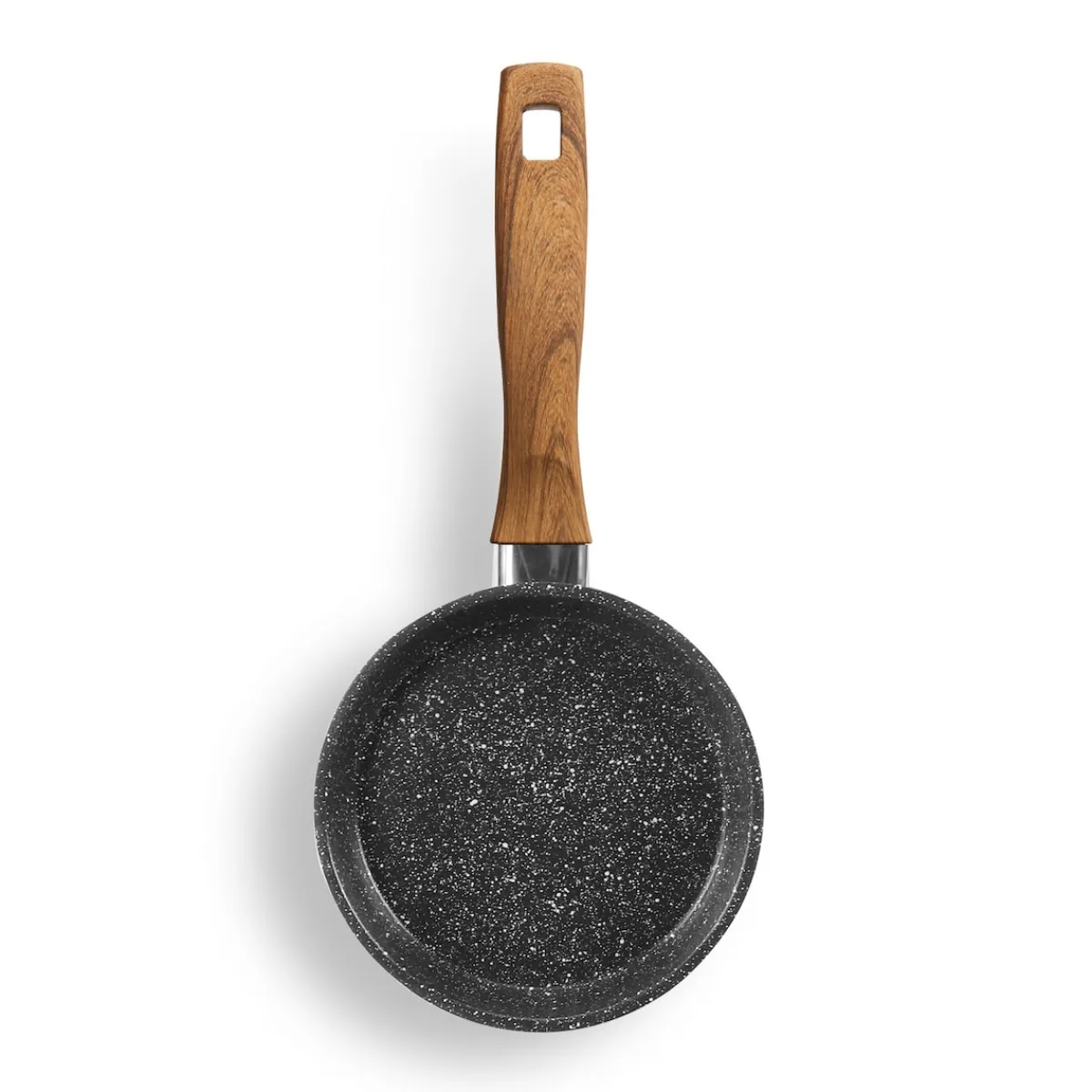 STONELINE – Das Original! Gesund fettfrei kochen und braten! Holz ist das angesagte Style-Element, um jedem Küchen-Ambiente einen warmen Akzent zu verleihen und eine beruhigende, ausgeglichene Atmosphäre zu schaffen. Die Back to Nature-Linie von STONELINE vereint diese Eigenschaften. Die Pfannen mit Griff in stilvoller Holzoptik werden selbst auf der gedeckten Tafel zu einem stimmigen Blickfang. Diese 14 cm Pfanne ist ein Muss in jeder Küche. Sie ist für sehr kleine Mengen optimal geeignet. Dank der speziellen STONELINE-Antihaftbeschichtung lassen sich Ihre Speisen – je nach Wunsch – mit oder ohne Bratfett und Ol zubereiten und ganz ohne Ankleben aus dem Kochgeschirr lösen. Hierbei spielt es keine Rolle, ob Sie auf Glaskeramik, Induktion, Elektro oder Gas kochen. In Pfannen mit der original STONELINE-Beschichtung bleiben keine hartnäckigen Reste haften und die einfache Handwäsche spart Ihnen Zeit und Mühe. 1 Bratpfanne Induktion, ø ca. 14 cm, Höhe: ca. 3,2 cm, ca. 0,4 l; Induktionsboden: Ø ca. 11,8 cm Die wichtigsten Vorteile des STONELINE Kochgeschirrs auf einen Blick: Weltweit einzige Antihaftbeschichtung mit echten Steinpartikeln Kratzfeste STONELINE-Antihaftbeschichtung Vitaminschonend kochen und braten ohne Fett und Ol Optimales Bratergebnis und kross gebratenes Fleisch Auch für Vegetarier geeignet: Gemüse bleibt knackig und saftig Kein Anbrennen und kein Ankleben Super leicht zu reinigen Extra starker, verzugsfreier Boden Bodenstärke: ca. 4,8 mm Für alle Herdarten geeignet, auch Induktion Backofengeeignet bis 180 °C Material: Aluminiumguss Reinigungs- und Pflegetipps: Vor dem ersten Gebrauch empfehlen wir, Ihr Koch- oder Backgeschirr mit etwas Wasser und einem milden Spülmittel gründlich auszuwaschen. Verteilen Sie anschließend mit einem Papierküchentuch einige Tropfen Speiseöl auf der Beschichtung. Bei der weiteren Nutzung können Sie auf den Einsatz von Fett oder Ol verzichten! Dank dem Easy-Clean-Effekt wird die Reinigung per Hand empfohlen. Einfach mit heißem Wasser, Handspülmittel und einem weichen Schwamm auswischen.