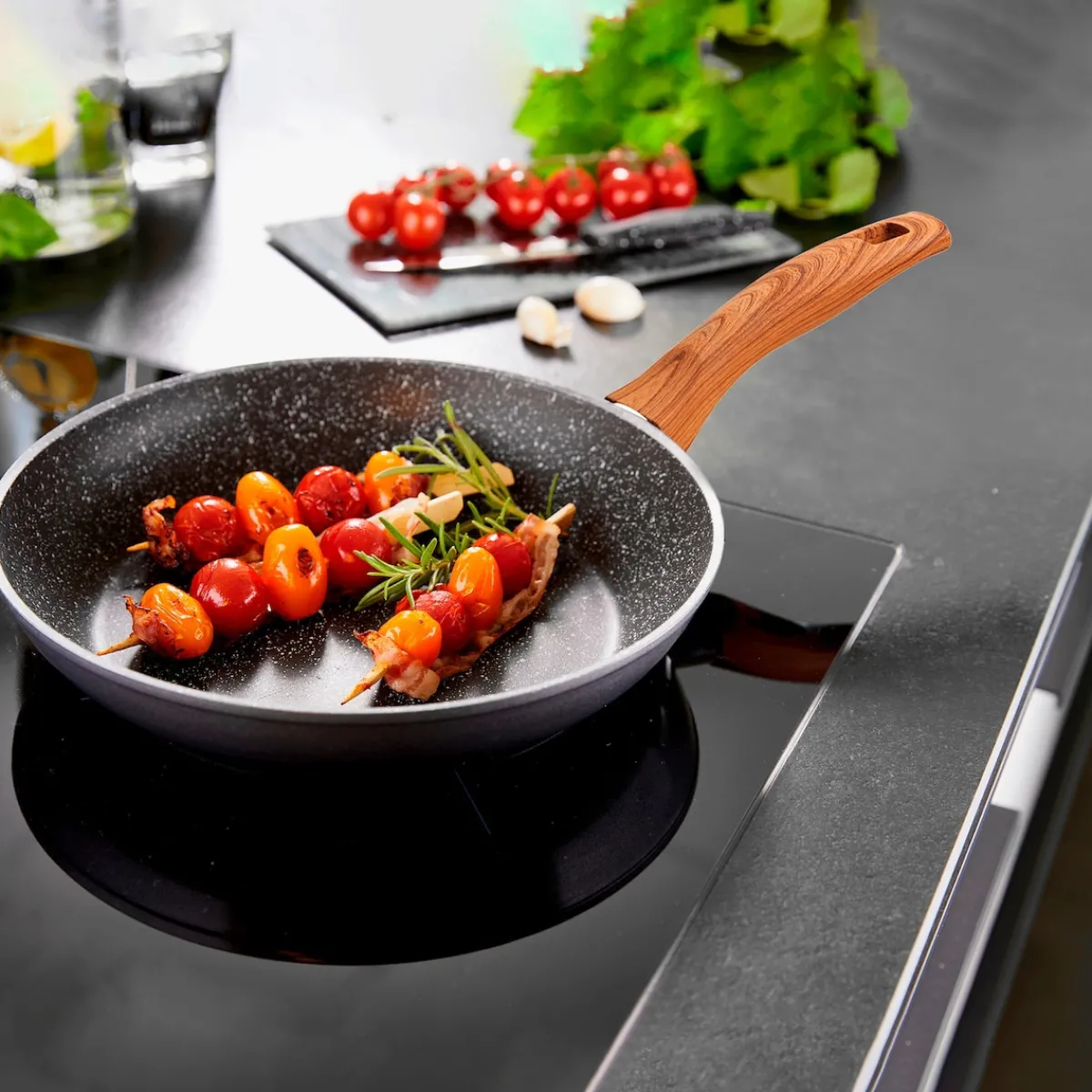 STONELINE – Das Original!Gesund fettfrei kochen und braten! Holz ist das angesagte Style-Element, um jedem Küchen-Ambiente einen warmen Akzent zu verleihen und eine beruhigende, ausgeglichene Atmosphäre zu schaffen. Die Back to Nature-Linie von STONELINE vereint diese Eigenschaften. Die Produkte in stilvoller Holzoptik werden selbst auf der gedeckten Tafel zu einem stimmigen Blickfang. Egal, ob Sie große Schnitzel anbraten oder mehrere Spiegeleier zubereiten wollen. Diese Pfanne bietet genügend Platz. Dank der speziellen STONELINE-Antihaftbeschichtung lassen sich Ihre Speisen – je nach Wunsch – mit oder ohne Bratfett und Ol zubereiten und ganz ohne Ankleben aus dem Kochgeschirr lösen. Hierbei spielt es keine Rolle, ob Sie auf Glaskeramik, Induktion, Elektro oder Gas kochen. In Kochgeschirr mit der original STONELINE-Beschichtung bleiben keine hartnäckigen Reste haften und die einfache Handwäsche spart Ihnen Zeit und Mühe. 1 Bratpfanne, ø ca. 28 cm, Höhe: ca. 5,1 cm, ca. 2,4 l – MADE IN GERMANY – Die wichtigsten Vorteile des STONELINE Kochgeschirrs auf einen Blick: Weltweit einzige Antihaftbeschichtung mit echten Steinpartikeln Kratzfeste STONELINE-Antihaftbeschichtung Vitaminschonend kochen und braten ohne Fett und Ol Optimales Bratergebnis und kross gebratenes Fleisch Auch für Vegetarier geeignet: Gemüse bleibt knackig und saftig Kein Anbrennen und kein Ankleben Super leicht zu reinigen Extra starker, verzugsfreier Boden Bodenstärke: 4,5 mm Für alle Herdarten geeignet, auch Induktion Backofengeeignet bis 180 °C Material: Aluminium geschmiedet Reinigungs- und Pflegetipps: Vor dem ersten Gebrauch empfehlen wir, Ihr Koch- oder Backgeschirr mit etwas Wasser und einem milden Spülmittel gründlich auszuwaschen.Verteilen Sie anschließend mit einem Papierküchentuch einige Tropfen Speiseöl auf der Beschichtung.Bei der weiteren Nutzung können Sie auf den Einsatz von Fett oder Ol verzichten!Dank dem Easy-Clean-Effekt wird die Reinigung per Hand empfohlen. Einfach mit heißem Wasser, Handspülmittel und einem weichen Schwamm auswischen.