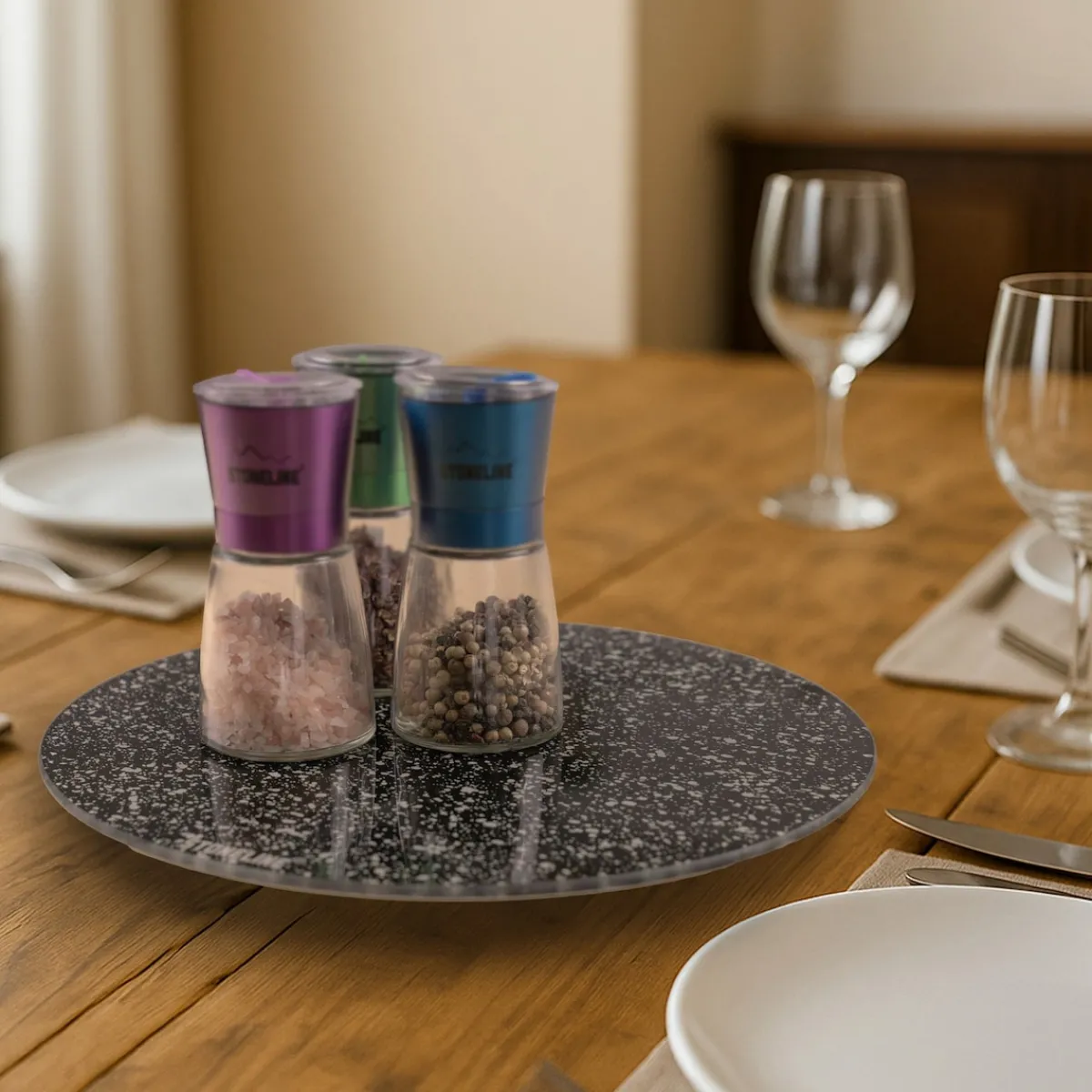 STONELINE – Das Original! Unsere drehbare Servierplatte aus Glas ist mit einem Durchmesser von 32 cm ideal für Familienessen, Partys und besondere Anlässe. Durch das zeitlose Design passt sie zu jedem Küchen- und Esszimmer-Ambiente. Der Drehteller ist nicht nur zuhause ein tolles Accessoire. Auch im Büro oder bei Veranstaltungen können darauf Vorspeisen, Hauptgerichte oder Desserts stilvoll und praktisch präsentiert werden. Die leichtgängige 360-Grad-Drehfunktion ermöglicht, alle darauf platzierten Speisen bequem zu entnehmen. Ob für Buffets, Käseplatten, Sushi oder Desserts – alles ist sofort griffbereit. Sie können den Servierteller auch als Topfuntersetzer für heiße Pfannen, Töpfe oder Auflaufformen benutzen. Gefertigt aus robustem, bruchsicherem Glas, ist diese Servierplatte nicht nur optisch ansprechend, sondern auch langlebig und widerstandsfähig. Der rutschhemmende Standfuß sorgt für einen sicheren Halt und verhindert Kratzer auf empfindlichen Oberflächen. Die glatte Oberfläche macht die Glasplatte sehr hygienisch. Sie ist geruchsneutral und kann einfach mit einem feuchten Tuch abgewischt werden. 1 Servierplatte aus Glas, ø ca. 32 cm, Stärke Servierplatte: ca. 2,5 mm, Gesamthöhe: ca. 2,6 cmDesign: STONELINE Die wichtigsten Vorteile auf einen Blick: Viele Verwendungsmöglichkeiten: Schneiden, vorbereiten, anrichten, servieren Auch als Topfuntersetzer geeignet Zeitloses Design Mit rutschhemmendem Standfuß Hygienisch und geruchsneutral Leicht zu reinigen dank glatter Oberfläche Material Servierplatte: bruchstabilisiertes Glas