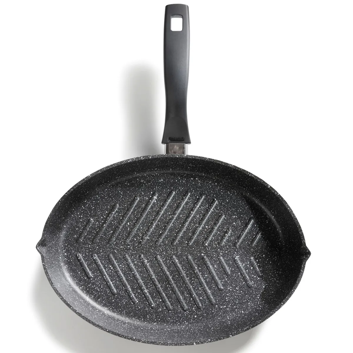 STONELINE – Das Original!Gesund fettfrei kochen und braten! Sie möchten große Wiener Schnitzel oder mehrere Rahm- oder Jägerschnitzel gleichzeitig zubereiten? Oder sich an die Zubereitung eines Zanders, einer Dorade oder anderer Speisefische wagen? Dank der ovalen Form bietet diese Fischpfanne Induktion ausreichend Platz, z. B. für mehrere Fleischstücke nebeneinander, für große Steaks wie das T-Bone-Steak, große Fischfilets und ganze Fische, die in keine runde Standardpfanne passen. Spezielle Wärmeleitlinien im Pfannenboden sorgen für die optimale Hitzeverteilung. Weiteres praktisches Extra: zwei Ausgüsse erleichtern das Abschütten von überschüssigem Fett oder Öl nach dem Anbraten. Dank der speziellen STONELINE-Antihaftbeschichtung lassen sich Ihre Speisen in der Stoneline Pfanne – je nach Wunsch – mit oder ohne Bratfett und Öl zubereiten und ganz ohne Ankleben aus dem Kochgeschirr lösen. Hierbei spielt es keine Rolle, ob Sie auf Glaskeramik, Induktion, Elektro oder Gas kochen. In Kochgeschirr mit der original STONELINE-Beschichtung bleiben keine hartnäckigen Reste haften und die einfache Handwäsche spart Ihnen Zeit und Mühe. 1 XXL Schnitzel- und Fischpfanne, ca. 35,2 x 24 cm, Höhe: ca. 5,0 cm, ca. 2,9 l, Induktionsboden: ca. 29,7 x 20 cm1 Glasdeckel, ca. 35,2 x 24,3 cm Die wichtigsten Vorteile des STONELINE Kochgeschirrs auf einen Blick: Weltweit einzige Antihaftbeschichtung mit echten Steinpartikeln Kratzfeste STONELINE-Antihaftbeschichtung Vitaminschonend kochen und braten ohne Fett und Öl Optimales Bratergebnis und kross gebratenes Fleisch Auch für Vegetarier geeignet: Gemüse bleibt knackig und saftig Kein Anbrennen und kein Ankleben Super leicht zu reinigen Extra starker, verzugsfreier Boden Bodenstärke: 4,5 mm Für alle Herdarten geeignet, auch Induktion Backofengeeignet bis 180 °C Material: Aluminiumguss Reinigungs- und Pflegetipps: Vor dem ersten Gebrauch empfehlen wir, Ihr Koch- oder Backgeschirr mit etwas Wasser und einem milden Spülmittel gründlich auszuwaschen.Verteilen Sie anschließend mit einem Papierküchentuch einige Tropfen Speiseöl auf der Beschichtung.Bei der weiteren Nutzung können Sie auf den Einsatz von Fett oder Öl verzichten!Dank dem Easy-Clean-Effekt wird die Reinigung per Hand empfohlen. Einfach mit heißem Wasser, Handspülmittel und einem weichen Schwamm auswischen.