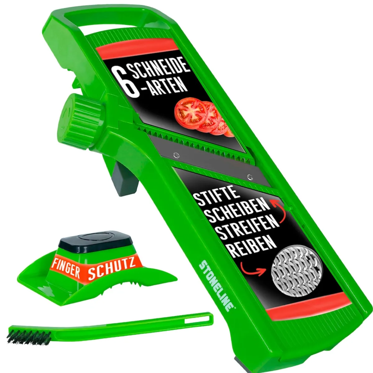 STONELINE – Das Original! Dieser vielseitige STONELINE Gemüseschneider mit sechs verschiedenen Schneidarten sollte in keiner Küche fehlen! Er ist ideal, um Kartoffeln, Kraut, Äpfel, Zwiebeln, Gurken, Möhren, Paprika und vieles mehr ganz leicht und gleichmäßig zu zerteilen. Die Edelstahlklingen mit mikrofeinem Schliff sorgen für ein sauberes und präzises Schneidergebnis. Mithilfe des seitlichen Drehrads kann die gewünschte Schneidart ausgewählt werden: dünne Scheiben mittlere Scheiben Dicke Scheiben Feine Streifen Stifte Zusätzlich besitzt der Gemüsehobel eine Reibe. Auf dieser separaten Fläche kannst du Lebensmittel in dünne Raspel zerkleinern. Der vielseitige Küchenhelfer ist einfach und platzsparend zu verstauen, da der Fuß klappbar und der Hobel damit vielseitig einsetzbar ist: bei ausgeklapptem Fuß zum Hobeln auf einer ebenen Fläche bei eingeklapptem Fuß zum Hobel auf einer Schüssel Für ein sicheres Schneiden ist der V Hobel mit Füßen aus rutschhemmendem Material ausgestattet. Der Fingerschutz-Halter sorgt für einen festen Halt des Schnittguts und ermöglicht das Verarbeiten von Obst und Gemüse bis auf einen minimalen Rest. Mit der mitgelieferten Reinigungsbürste kannst du den Gemüsehobel einfach unter fließendem Wasser abspülen und Speisereste aus dem herausnehmbaren Schneideinsatz und der Reibe entfernen. Dieses Set besteht aus:1 Gemüseschneider mit 5 verschiedenen Klingen und 1 separater Reibfläche 1 Fingerschutz-Halter 1 ReinigungsbürsteIn der Farbe: Grün Die wichtigsten Vorteile auf einen Blick: Vielseitig verwendbarer Hobel mit Drehrad zum Wechseln zwischen 5 verschiedenen Schneidarten Mit separater Reibfläche Ideal zum Zerkleinern von Obst, Gemüse, Käse u. v. m. Mikrofein geschliffene Klingen für einen präzisen und schnellen Schnitt Extra sicher dank Fingerschutz-Halter und rutschfestem Fuß Material Klingen: rostfreier Edelstahl