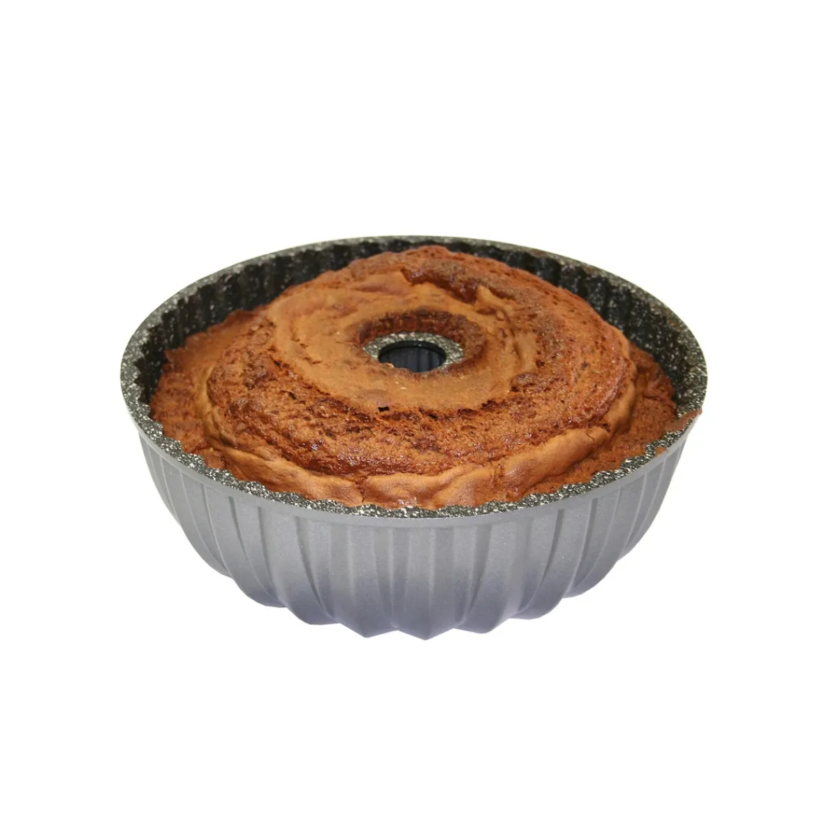 STONELINE – Das Original!Gesund fettfrei backen! Sie backen gerne Gugelhupf aber Ihnen bleibt der Kuchen immer in der Form kleben? Dann sollte diese Gugelhupf-Backform in Ihrer Küche nicht fehlen. Probieren Sie nicht nur das klassische Gugelhupf-Rezept aus, sondern testen Sie Backvarianten mit herzhaftem Teig oder sogar Aufläufe. Ihrer Kreativität sind keine Grenzen gesetzt. Durch die sehr gute Wärmeleitfähigkeit und das hochwertige Aluguss-Material erhalten Sie ein rundum knuspriges Backergebnis. Die robusten Backformen mit der original STONELINE-Beschichtung verhindern das Ankleben, sorgen für ein gleichmäßiges Backen und erlauben das einfache Herauslösen Ihres Backwerks. Es bleiben keine hartnäckigen Reste haften und die einfache Handwäsche spart Ihnen Zeit und Mühe. 1 Gugelhupf-Backform, ø ca. 24,5 cm, Höhe: ca. 9,0 cm, ca. 2,6 l Die wichtigsten Vorteile des STONELINE Backgeschirrs auf einen Blick: Weltweit einzige Antihaftbeschichtung mit echten Steinpartikeln Kratzfeste STONELINE-Antihaftbeschichtung Optimales Backergebnis Bester Geschmack Kein Anbrennen und kein Ankleben Super leicht zu reinigen Backofengeeignet bis 260 °C Material: Aluminiumguss Reinigungs- und Pflegetipps: Vor dem ersten Gebrauch empfehlen wir, Ihr Koch- oder Backgeschirr mit etwas Wasser und einem milden Spülmittel gründlich auszuwaschen.Verteilen Sie anschließend mit einem Papierküchentuch einige Tropfen Speiseöl auf der Beschichtung.Bei der weiteren Nutzung können Sie auf den Einsatz von Fett oder Öl verzichten!Dank dem Easy-Clean-Effekt wird die Reinigung per Hand empfohlen. Einfach mit heißem Wasser, Handspülmittel und einem weichen Schwamm auswischen.