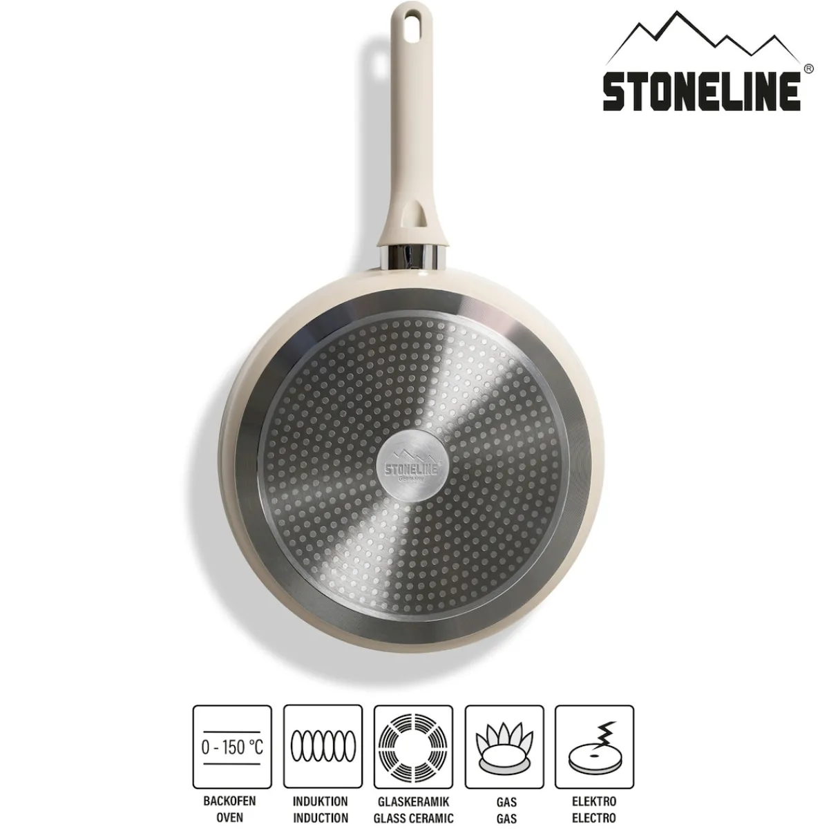 STONELINE – Das Original!Gesund fettfrei kochen und braten! Harmonie und Leichtigkeit. Verleihe deiner Küche einen ruhigen, modernen Look mit der STONELINE Schmorpfanne in der warmen Farbe Creme. Der elegante Übergang von Weiß zu Creme sorgt für einen harmonischen, zeitlosen Look und bringt gleichzeitig ein perfektes Gleichgewicht zwischen Trend und Moderne in deine Küche. Dieses Set ist nicht nur ein Hingucker, sondern schafft eine stilvolle Atmosphäre, die deine Kochmomente zu einem besonderen Erlebnis macht. Mit modernem Design und kreativen Akzenten wird jedes Gericht zu einem Genuss – sowohl für den Gaumen als auch für das Auge! Die Universalpfanne ist der perfekte Küchenhelfer für jeden Anlass. Egal, ob du schnell etwas braten oder ein aufwendigeres Gericht zaubern möchtest – mit der praktischen Antihaft Pfanne mit Deckel hast du immer das richtige Kochgeschirr zur Hand und die Zubereitung deiner Lieblingsgerichte macht doppelt soviel Spaß. Mit dem extra hohen Rand von 7,6 cm und über 4 Liter Fassungsvermögen eignet sie sich hervorragend für alle Brat- und Schmorgerichte und lässt sich auch für Gerichte nutzen, die etwas mehr Platz brauchen. Der Glasdeckel mit Platinsilikonrand ist eine großartige Ergänzung zu deinem Kochgeschirr. Der Platinsilikonrand schützt nicht nur die Antihaftbeschichtung deiner Pfanne, sondern sorgt auch dafür, dass der Deckel bruchsicherer ist. Durch den gut schließenden Rand wird Energie effizienter genutzt und das Kochen noch schneller. Zudem bieten der Deckel eine praktische Ausschütt-Funktion, die das Abgießen von Flüssigkeiten erleichtert – ganz ohne zusätzliches Sieb. Der Knauf des Deckels bleibt angenehm kühl, damit du dich während des Kochvorgangs nicht verbrennst. So wird das Kochen noch komfortabler und sicherer! Mit dieser Pfanne kannst du dich auf jede Mahlzeit freuen, die du mit Liebe und Kreativität zubereitest. Sie bringt nicht nur Stil in deine Küche, sondern sorgt auch dafür, dass du dich beim Kochen voll und ganz auf den Geschmack konzentrieren kannst. Hol dir das Set und genieße das Kochen in vollen Zügen! Dank der speziellen STONELINE Antihaftbeschichtung in Goldoptik kannst du deine Speisen in der Pfanne – je nach Wunsch – mit oder ohne Bratfett und Ol zubereiten und sie ganz ohne Ankleben aus dem Kochgeschirr lösen. Es spielt keine Rolle, ob du auf Glaskeramik, Induktion, Elektro oder Gas kochst. In der Pfanne mit der original STONELINE Antihaftbeschichtung bleiben keine hartnäckigen Reste haften und die einfache Handwäsche spart dir Zeit und Mühe. 1 Schmorpfanne, ø ca. 28 cm, Höhe: ca. 7,6 cm, ca. 4,1 l, Induktionsboden: ø ca. 20,7 cm1 Glasdeckel, ø ca. 28 cm In der Farbe: Creme Die wichtigsten Vorteile auf einen Blick: Weltweit einzige Antihaftbeschichtung mit echten Steinpartikeln Kratzfeste STONELINE-Antihaftbeschichtung Glasdeckel mit Edelstahlrand Vitaminschonend kochen und braten ohne Fett und Ol Optimales Bratergebnis und kross gebratenes Fleisch Auch für Vegetarier geeignet: Gemüse bleibt knackig und saftig Kein Anbrennen und kein Ankleben Super leicht zu reinigen dank Easy-Clean Effekt Extra starker, verzugsfreier Boden Bodenstärke: ca. 4 mm Für alle Herdarten geeignet, auch Induktion Backofengeeignet bis 150 °C Material: Aluminium Reinigungs- und Pflegetipps: Vor dem ersten Gebrauch empfehlen wir, dein Koch- oder Backgeschirr mit etwas Wasser und einem milden Spülmittel gründlich auszuwaschen. Verteile anschließend mit einem Papierküchentuch einige Tropfen Speiseöl auf der Beschichtung.Bei der weiteren Nutzung kannst du auf den Einsatz von Fett oder Ol verzichten!Dank dem Easy-Clean-Effekt wird die Reinigung per Hand empfohlen. Einfach mit heißem Wasser, Handspülmittel und einem weichen Schwamm auswischen.