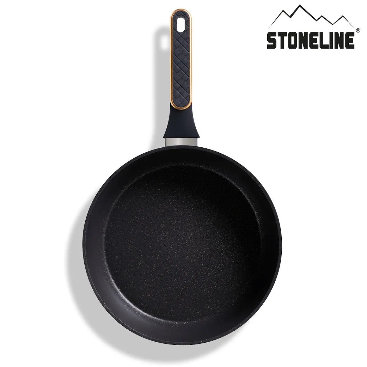 STONELINE – Das Original!Gesund fettfrei kochen und braten! Eleganz und Leidenschaft. Verleihe deiner Küche einen modernen, edlen Touch mit der STONELINE Schmorpfanne in Mattschwarz. Die eleganten Roségold-Details an dem Deckel und den Griffen setzen stilvolle Akzente und bringen einen Hauch von Luxus in deine Küche. Die einzigartige Farbkombination von Mattschwarz und Roségold vereint schlichte Eleganz mit einem modernen, luxuriösen Design. Mit diesem Set machst du nicht nur dein Kochen noch mehr zum Erlebnis, sondern setzt auch ein Statement für modernes Design und stilvolles Kochen. Hol dir das perfekte Zusammenspiel aus Funktion und Ästhetik und lass deine kulinarischen Kreationen noch mehr glänzen! Die Universalpfanne ist der perfekte Küchenhelfer für jeden Anlass. Egal, ob du schnell etwas braten oder ein aufwendigeres Gericht zaubern möchtest – mit der praktischen Antihaft Pfanne mit Deckel hast du immer das richtige Kochgeschirr zur Hand und die Zubereitung deiner Lieblingsgerichte macht doppelt soviel Spaß. Mit dem extra hohen Rand von 7,6 cm und über 4 Liter Fassungsvermögen eignet sie sich hervorragend für alle Brat- und Schmorgerichte und lässt sich auch für Gerichte nutzen, die etwas mehr Platz brauchen. Der Glasdeckel mit Edelstahlrand in Roségold ist eine großartige Ergänzung zu deinem Kochgeschirr. Der Knauf des Deckels bleibt angenehm kühl, damit du dich während des Kochvorgangs nicht verbrennst. So wird das Kochen noch komfortabler und sicherer! Mit dieser Pfanne kannst du dich auf jede Mahlzeit freuen, die du mit Liebe und Kreativität zubereitest. Sie bringt nicht nur Stil in deine Küche, sondern sorgt auch dafür, dass du dich beim Kochen voll und ganz auf den Geschmack konzentrieren kannst. Hol dir das Set und genieße das Kochen in vollen Zügen! Dank der speziellen STONELINE Antihaftbeschichtung in Goldoptik kannst du deine Speisen in der Pfanne – je nach Wunsch – mit oder ohne Bratfett und Ol zubereiten und sie ganz ohne Ankleben aus dem Kochgeschirr lösen. Es spielt keine Rolle, ob du auf Glaskeramik, Induktion, Elektro oder Gas kochst. In der Pfanne mit der original STONELINE Antihaftbeschichtung bleiben keine hartnäckigen Reste haften und die einfache Handwäsche spart dir Zeit und Mühe. 1 Schmorpfanne, ø ca. 28 cm, Höhe: ca. 7,6 cm, ca. 4,1 l, Induktionsboden: ø ca. 20,7 cm1 Glasdeckel, ø ca. 28 cm In der Farbe: Schwarz / Roségold Die wichtigsten Vorteile auf einen Blick: Weltweit einzige Antihaftbeschichtung mit echten Steinpartikeln Kratzfeste STONELINE-Antihaftbeschichtung Glasdeckel mit Edelstahlrand Vitaminschonend kochen und braten ohne Fett und Ol Optimales Bratergebnis und kross gebratenes Fleisch Auch für Vegetarier geeignet: Gemüse bleibt knackig und saftig Kein Anbrennen und kein Ankleben Super leicht zu reinigen dank Easy-Clean Effekt Extra starker, verzugsfreier Boden Bodenstärke: ca. 4 mm Für alle Herdarten geeignet, auch Induktion Backofengeeignet bis 150 °C Material: Aluminium Reinigungs- und Pflegetipps: Vor dem ersten Gebrauch empfehlen wir, dein Koch- oder Backgeschirr mit etwas Wasser und einem milden Spülmittel gründlich auszuwaschen. Verteile anschließend mit einem Papierküchentuch einige Tropfen Speiseöl auf der Beschichtung.Bei der weiteren Nutzung kannst du auf den Einsatz von Fett oder Ol verzichten!Dank dem Easy-Clean-Effekt wird die Reinigung per Hand empfohlen. Einfach mit heißem Wasser, Handspülmittel und einem weichen Schwamm auswischen.