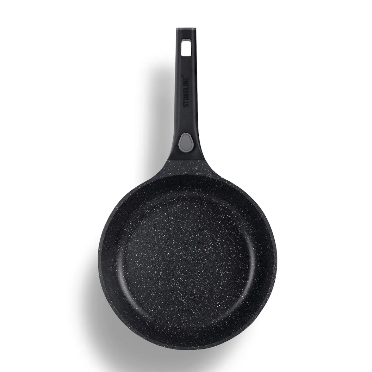 STONELINE – Das Original! Gesund fettfrei kochen und braten! STONELINE Smart – Das intelligente Kochgeschirr für deine Küche Mit der STONELINE Smart Serie wird Kochen, Backen und Servieren so einfach und flexibel wie nie zuvor! Das hochwertige Kochgeschirr aus Aluguss kombiniert durchdachte Funktionen mit modernem Design, langanhaltender Qualität und maximalem Komfort. Der abnehmbare Griff macht das Kochgeschirr besonders vielseitig: Spare Platz bei der Zubereitung auf dem Herd, beim Servieren auf dem Esstisch und bei der Aufbewahrung im Kühlschrank. Außerdem wird dein Kochgeschirr mit abgenommenen Griffen im Handumdrehen ofenfest. Du kannst die Pfannen beispielsweise als Auflaufformen zum Überbacken von Gerichten verwenden. Das spart Zeit und auch zusätzliches Koch- und Backgeschirr. Das 2-teilige Pfannenset bietet dir die Flexibilität, zwischen zwei verschiedenen Größen zu wählen, sodass du immer die perfekte Pfanne für dein Gericht hast. Die Bratpfannen sind sehr geräumig und bieten ausreichend Platz, um auch größere Portionen problemlos zuzubereiten und zu wenden. So bleibt alles in der Pfanne und du kannst dein Gericht perfekt zubereiten, ohne dass etwas herausfällt. Ob Pfanne, Topf oder ganzes Topfset – die STONELINE Smart Serie überzeugt durch ihr robustes Aluminiumguss-Material und garantiert eine optimale Wärmespeicherung und ein energieeffizientes Kochen. Es ist für alle Herdarten geeignet, auch für Induktion. Dank der patentierten STONELINE Antihaftbeschichtung mit echten Steinpartikeln kannst du gesund fettfrei braten, ohne dass etwas haften bleibt oder anbrennt. Die Reinigung ist kinderleicht und spart dir Zeit – meist genügt es, die Pfanne oder den Topf einfach mit etwas Spülmittel, heißem Wasser und einem feuchten Tuch auszuwischen und das Kochgeschirr ist sofort wieder einsatzbereit. Lieferumfang: 1 Bratpfanne, ø ca. 24 cm, Höhe: ca. 5,5 cm, ca. 2,0 l, Induktionsboden: ø ca. 16 cm1 Bratpfanne, ø ca. 28 cm, Höhe: ca. 6 cm, ca. 3,0 l, Induktionsboden: ø ca. 20 cmIn der Farbe: Grau Die wichtigsten Vorteile auf einen Blick: Weltweit einzige Antihaftbeschichtung mit echten Steinpartikeln Kratzfeste STONELINE-Antihaftbeschichtung Abnehmbare Griffe für flexible Einsatzmöglichkeiten Vitaminschonend kochen und braten ohne Fett und Öl Optimales Bratergebnis und kross gebratenes Fleisch Auch für Vegetarier geeignet: Gemüse bleibt knackig und saftig Kein Anbrennen und kein Ankleben Super leicht zu reinigen dank Easy-Clean Effekt Extra starker, verzugsfreier Boden Bodenstärke: ca. 4,5 mm Für alle Herdarten geeignet, auch Induktion Backofengeeignet bis 260 °C (ohne Griff) / 220 °C (mit Griff) Material: Aluminiumguss Reinigungs- und Pflegetipps: Vor dem ersten Gebrauch empfehlen wir, dein Koch- oder Backgeschirr mit etwas Wasser und einem milden Spülmittel gründlich auszuwaschen. Verteile anschließend mit einem Papierküchentuch einige Tropfen Speiseöl auf der Beschichtung.Bei der weiteren Nutzung kannst du auf den Einsatz von Fett oder Öl verzichten!Dank dem Easy-Clean-Effekt wird die Reinigung per Hand empfohlen. Einfach mit heißem Wasser, Handspülmittel und einem weichen Schwamm auswischen.