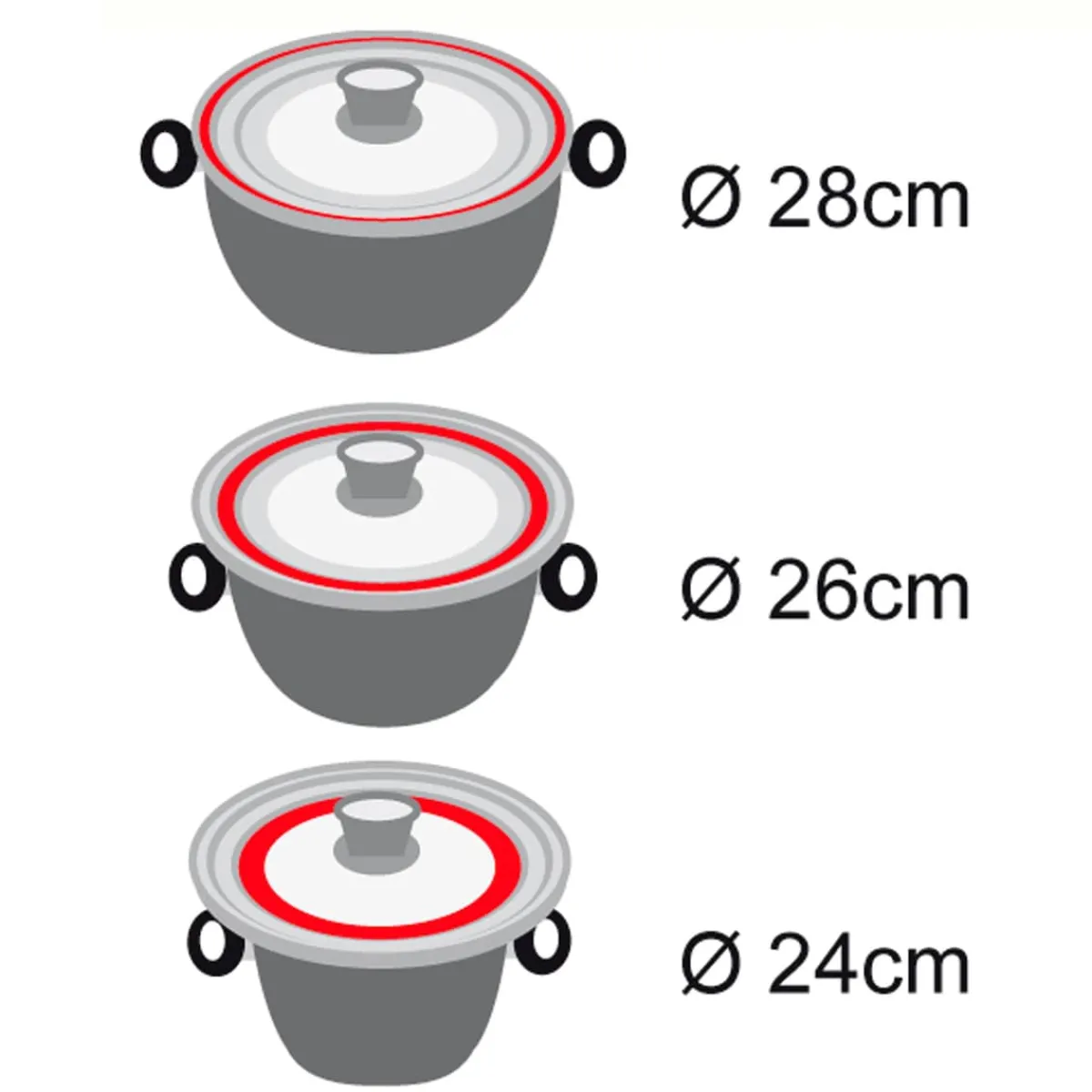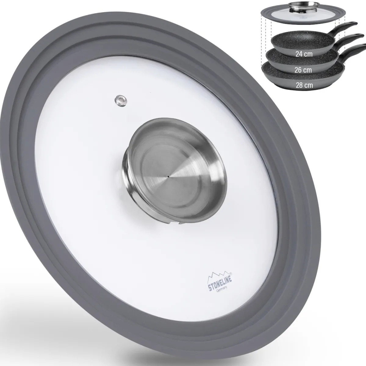 STONELINE – Das Original! Sie kennen wahrscheinlich das Problem, eine komplette Schublade voll mit unzähligen Glasdeckeln zu haben und dennoch finden Sie den passenden Deckel für Ihre Pfanne oder Ihren Topf nicht. Nun ist Schluss mit dem „Deckel-Chaos“ – dank des Universalglasdeckels von STONELINE! Der Universalglasdeckel von STONELINE mit Silikonrand passt auf drei verschiedene Pfannen- und Topfgrößen und verfügt über die einzigartige Aroma-Funktion! Der Aroma-Glasdeckel ermöglicht eine dosierte Zugabe von Flüssigkeiten wie z. B. Wein, flüssige Gewürze oder andere Essenzen über den Deckelknauf. So erhalten Ihre verfeinerten Speisen den unverkennbaren Geschmack der zugegebenen Aromen. Der Silikonrand schont die Oberfläche des Kochgeschirrs und macht den Glasdeckel bruchsicherer. 1 Aroma-Glasdeckel mit Silikonrand für die Größen ø 24/26/28 cm 1 Deckel für 3 Größen: Passend für alle Töpfe und Pfannen von ø 24 bis 28 cm Aroma-Funktion ermöglicht dosierte Zugabe von Flüssigkeiten Sichtfenster aus Glas Mit Dampfauslass Silikonrand schont die Beschichtung und macht den Deckel bruchsicherer Hitzebeständig bis 180 °C Material: Glas, Edelstahl, Silikon