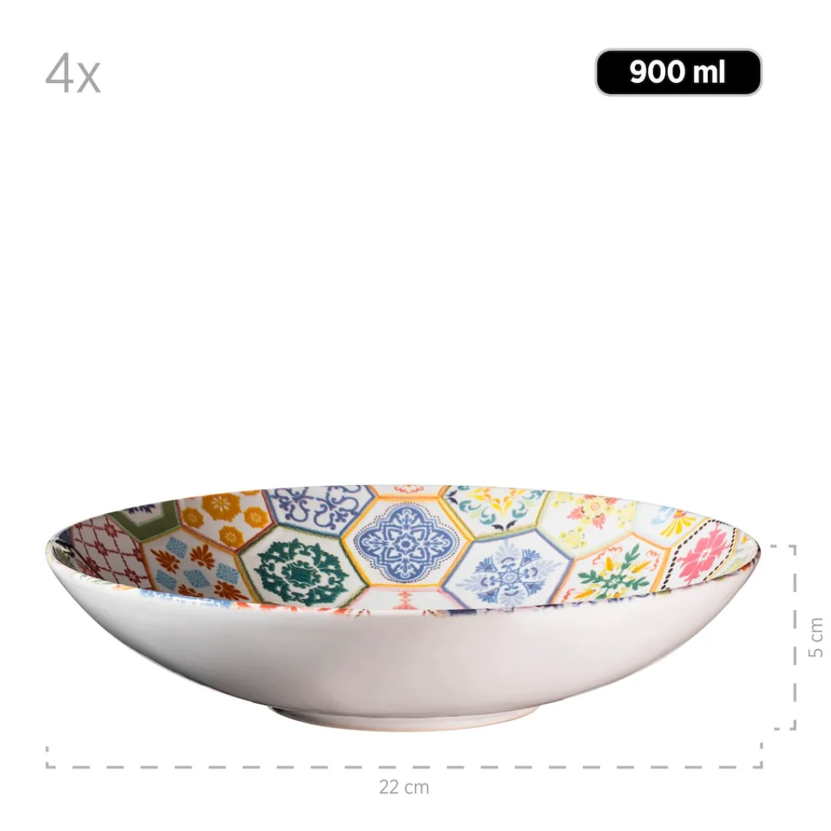Die Keramikgeschirr Serie „Amarante“ der österreichischen Traditionsmarke Mäser sticht durch das markante Ornament-Dekor sofort ins Auge. Die Kollektion ist von der traditionellen Fliesenkunst in Portugal inspiriert und versprüht südländische Lebensfreude. Die verschiedenen kleinen Details fügen sich auf der modernen, großzügig gehaltenen Coupe-Form zu einem harmonischen Gesamtbild zusammen, das den perfekten Rahmen für Ihre kulinarischen Kreationen bildet. Gefertigt in Portugal aus hochwertigem Steinzeug, werden Sie an dieser besonderen Essgeschirr-Kollektion lange Freude haben. Die gesamte Tafelgeschirr Serie „Amarante“ ist mikrowellen- und spülmaschinengeeignet, ohne dass das schöne Dekor an Glanz verliert. Dieses Set wird in einer auf Bruchsicherheit getesteten Paketversandverpackung aus ressourcenschonenden Materialien versendet. Um eine objektive Vergleichbarkeit zu gewährleisten, gehen unsere Füllmengenangaben von einer randvollen Befüllung aus.
