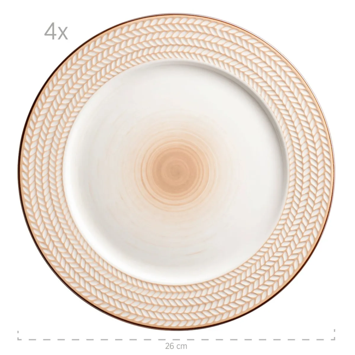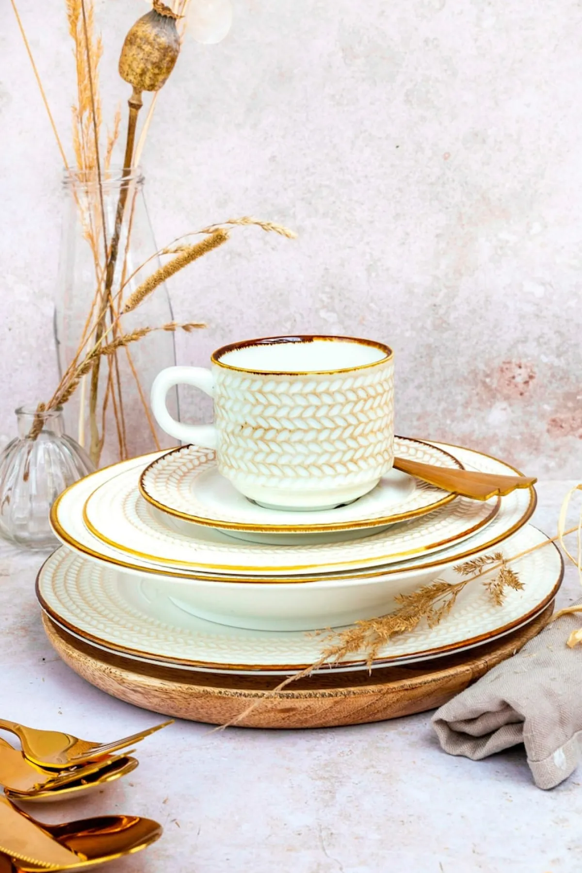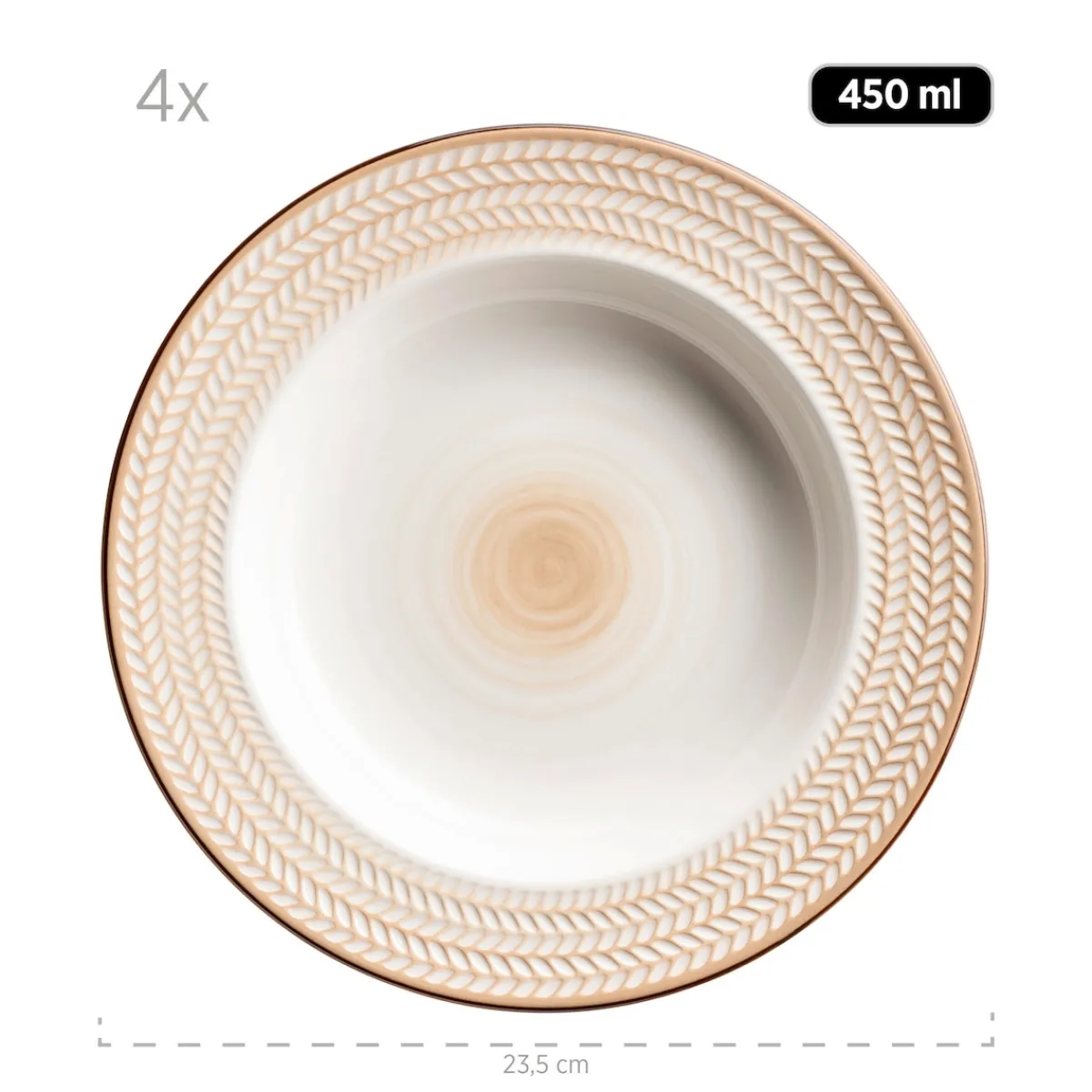 Aufregend exquisit präsentiert sich die ausdrucksstarke Premium-Kollektion „Prospero“ der österreichischen Traditionsmarke MÄSER. Eine an geschichtsträchtige Lorbeerkränze erinnernde, haptisch fühlbare Reliefstruktur umläuft ein handgepinseltes Spiraldekor, welches jedes Teil zu einem echten Unikat macht. Gefertigt aus robustem und langlebigem Durable Porzellan in dickwandiger, schwerer Qualität erfüllt diese Tafelgeschirr-Serie die besonderen Ansprüche der gehobenen Gastronomie und anspruchsvoller Privatkunden. Die einzigartige Kombination aus fließender Dynamik und selbstbewusster Eleganz wird sanft eingerahmt durch eine händisch aufgemalte, unregelmäßig schimmernde ockerfarbene Umrandung. Die sorgfältig aufeinander abgestimmten Farben dieser Kollektion ermöglichen einen täglich neu erschaffenen Esstisch, der optisch perfekt zu Ihren Speisen passt. Selbstverständlich ist die gesamte Serie „Prospero“ mikrowellengeeignet und dauerhaft spülmaschinenfest. Dieses Set wird in einer sicheren Transportverpackung aus ressourcenschonenden Materialien versendet. Bitte beachten Sie: Für eine objektive Vergleichbarkeit gehen unsere Füllmengenangaben von einer randvollen Befüllung aus. Aufgrund des hohen handwerklichen Anteils sind kleine Unregelmäßigkeiten und Farbabweichungen in der Glasur möglich.