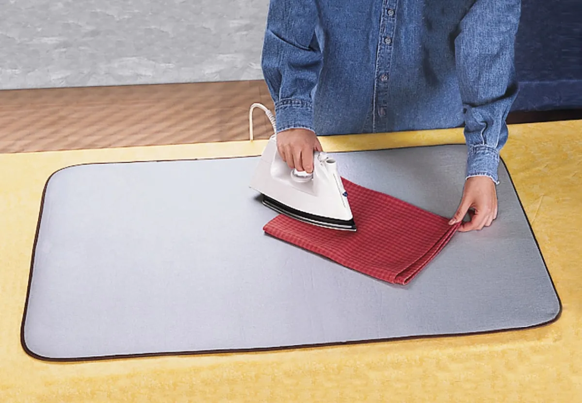 Ohne Bügelbrett bügeln – möglich machts die Bügel Tischauflage. Mit ihrem wärmedämmenden Unterpolster aus Polyurethan-Schaumstoff und der metallbeschichteten Oberseite aus 100% Baumwolle schont sie jeden Tisch.