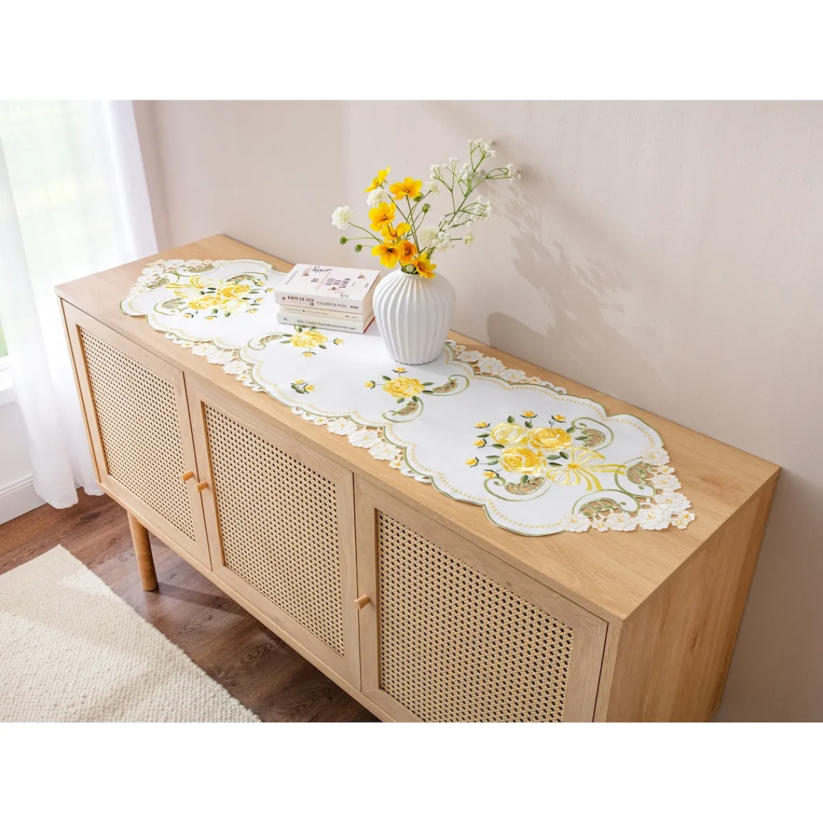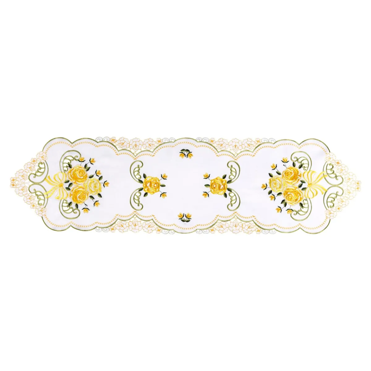 Dieser Tischläufer verleiht Ihrem Zuhause eine romantische Note. Mit seinem fein bestickten Rosenmuster wird er zum Blickfang auf jedem Tisch – ob im Alltag oder zu besonderen Anlässen. Das edle Design fügt sich harmonisch in jede Einrichtung ein und sorgt für eine stilvolle Atmosphäre. Zudem ist das pflegeleichte Material langlebig und bleibt dauerhaft schön. Ein Must-have für Liebhaber zeitloser Eleganz!