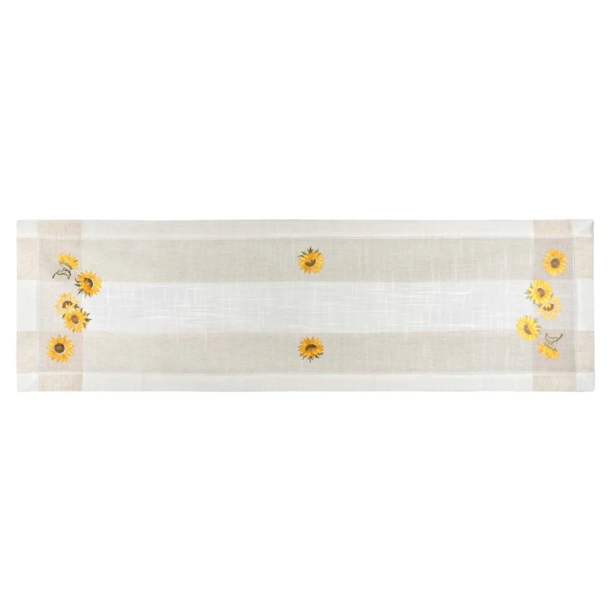 Erwecken Sie Ihren Esstisch zum Leben mit unserem Tischläufer in Leinenoptik, der von der Natur inspiriert ist. Die dekorative Sonnenblumenstickerei verleiht Ihrem Zuhause eine warme und einladende Atmosphäre. Dieser Tischläufer vereint zeitlose Eleganz mit Robustheit. Die Leinenmischung sorgt für Langlebigkeit, während die Sonnenblumenmotive eine fröhliche Note setzen. Perfekt für Familienessen oder romantische Abendessen, wird dieser Tischläufer im Handumdrehen zum Blickfang. Entdecken Sie die Schönheit der Natur in Ihrem eigenen Zuhause und verleihen Sie Ihrem Tisch sonnige Eleganz!