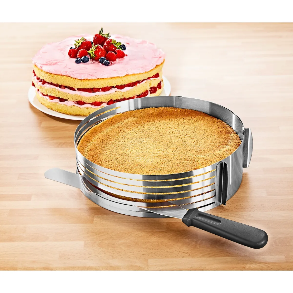 Wie vom Bäcker! Dank der cleveren Schneidehilfe mit Rillen und Gratis Konditormesser gelingen Ihnen gleichmäßige Böden für Tortenträume ab jetzt spielend leicht! Einfach den Durchmesser von 24 bis 30 cm einstellen und los geht’s!