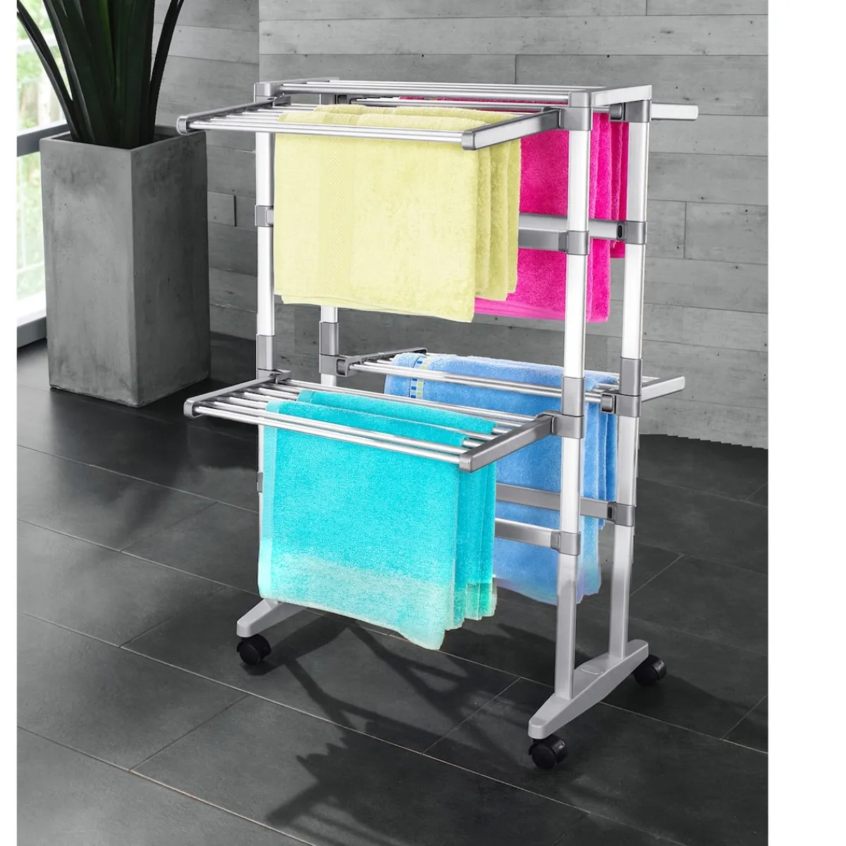 Der stabile Wäschetrockner lässt sich leicht überall hinrollen und kann für schnelleres Trocknen auch mal direkt vor einen Heizkörper geschoben werden.