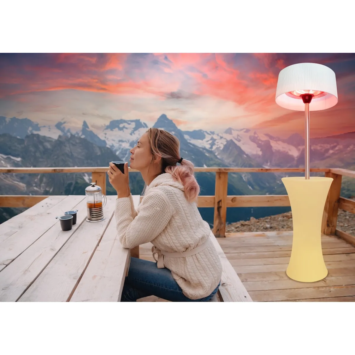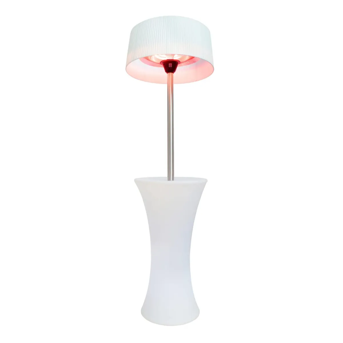 Die Aussenheizung im edlen Design ist wasserabweisend und hat einen integrierten Tisch. Mittels Fernbedienung kann die LED-Beleuchtung eingestellt und zwischen 16 Farben und 5 Farbweseloptionen gewählt werden. Die Heizung verfügt über 3 Heizstufen und dient sowohl als Heiz- wie auch als Lichtspender. Als Zusatz ist ein Federnschirm erhältlich.