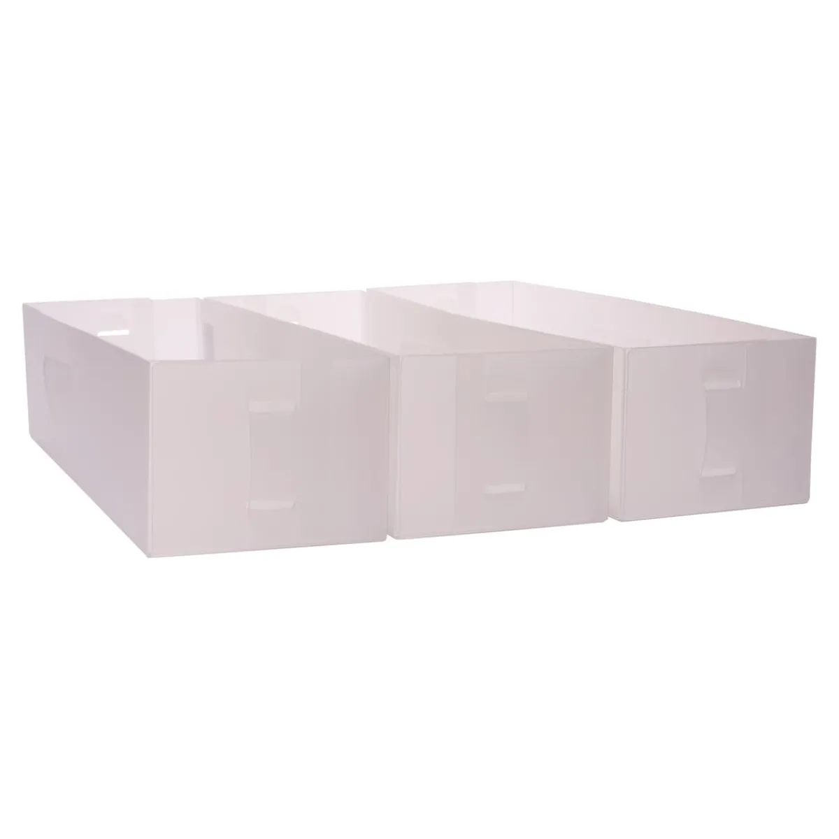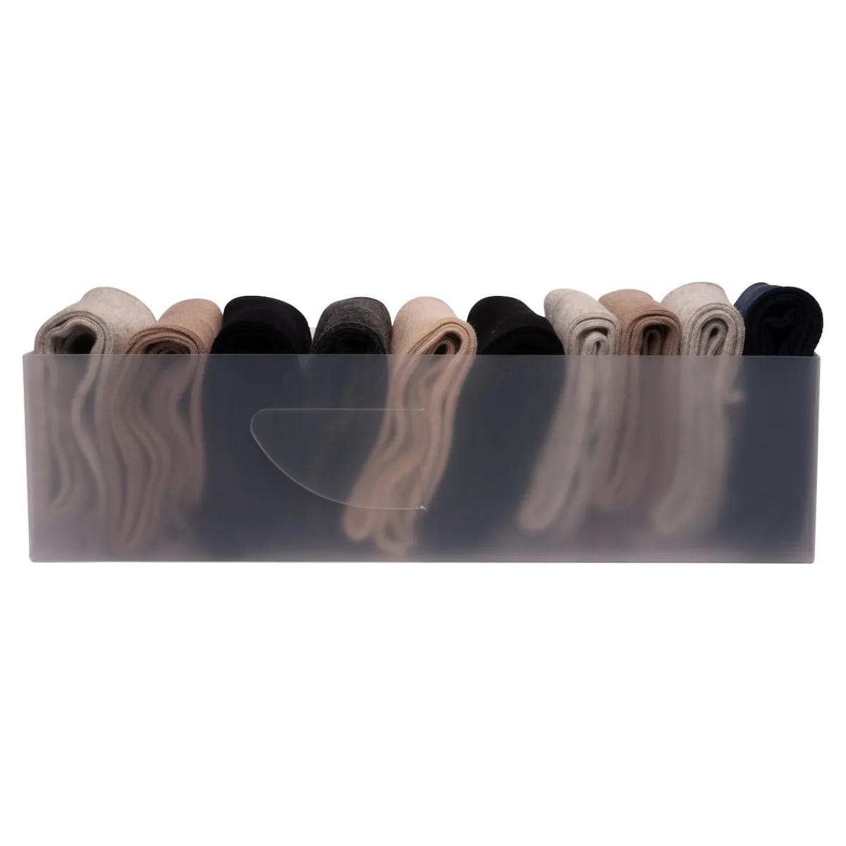 Wenn in der Socken- oder Unterwäsche-Schublade mal wieder Chaos herrscht, ist dieses dreiteilige Organizer-Set die ideale Lösung. Die faltbaren Kästchen aus einem leichten und halbtransparentem Kunststoff lassen sich wahlweise einzeln, zu zweit oder zu dritt nebeneinander in die Schublade stellen. Hier bieten sie viel Platz, um je nach Bedarf Socken, Strümpfe, Boxershorts, Slips oder BHs einzusortieren. Ob nach Farbe, Muster, Material, Wochentag oder nach Lust und Laune, ist dabei natürlich ganz den persönlichen Ordnungsvorlieben überlassen.