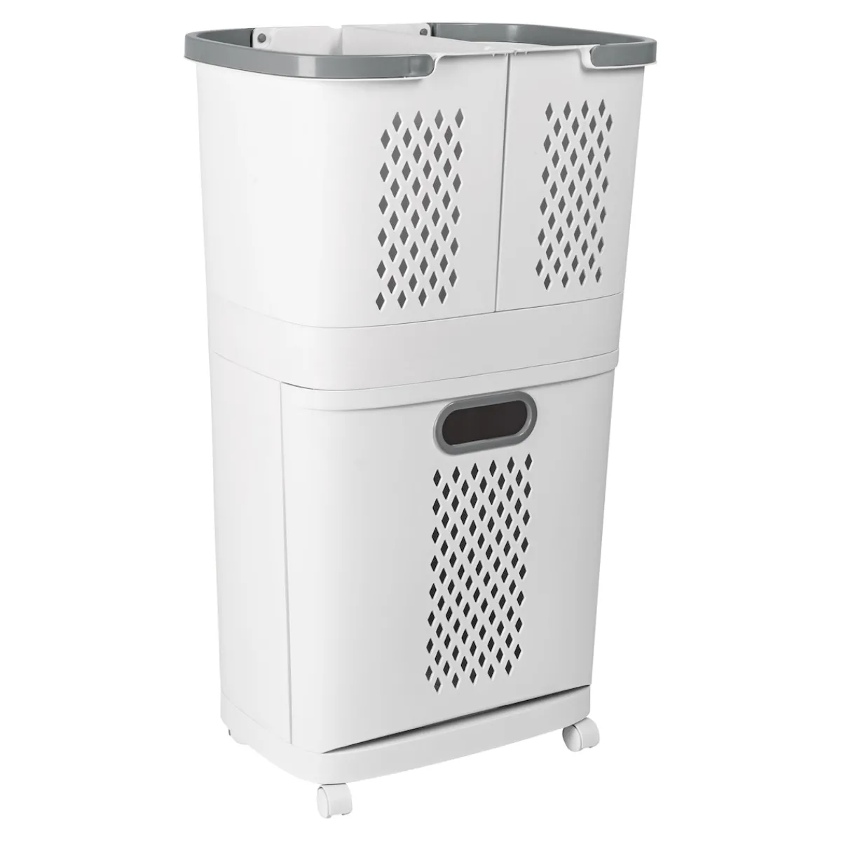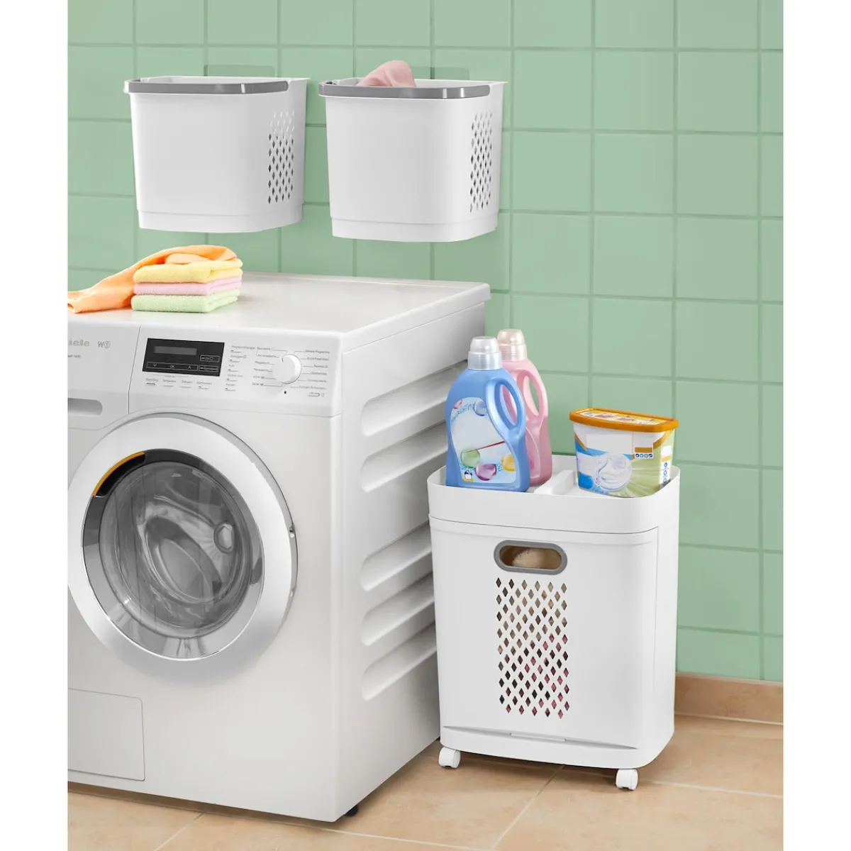 Mit unserem Wäschekorb-Organizer ‚3 in 1‘ wird Ordnung zum Kinderspiel! Dieses durchdachte System besteht aus drei einzeln entnehmbaren Körben, die perfekt zueinander passen. Unten befindet sich ein großer Korb auf Rollen mit einer praktischen Klappe an der Vorderseite. Oben finden Sie zwei weitere Körbe mit umklappbaren Henkeln. Diese können entweder auf dem Basiskorb stehen oder separat an Wand oder Schrank mithilfe der mitgelieferten Klebehaken befestigt werden. Dadurch eignen sie sich nicht nur für Wäsche, sondern auch für verschiedene Accessoires und Aufbewahrungsmöglichkeiten.