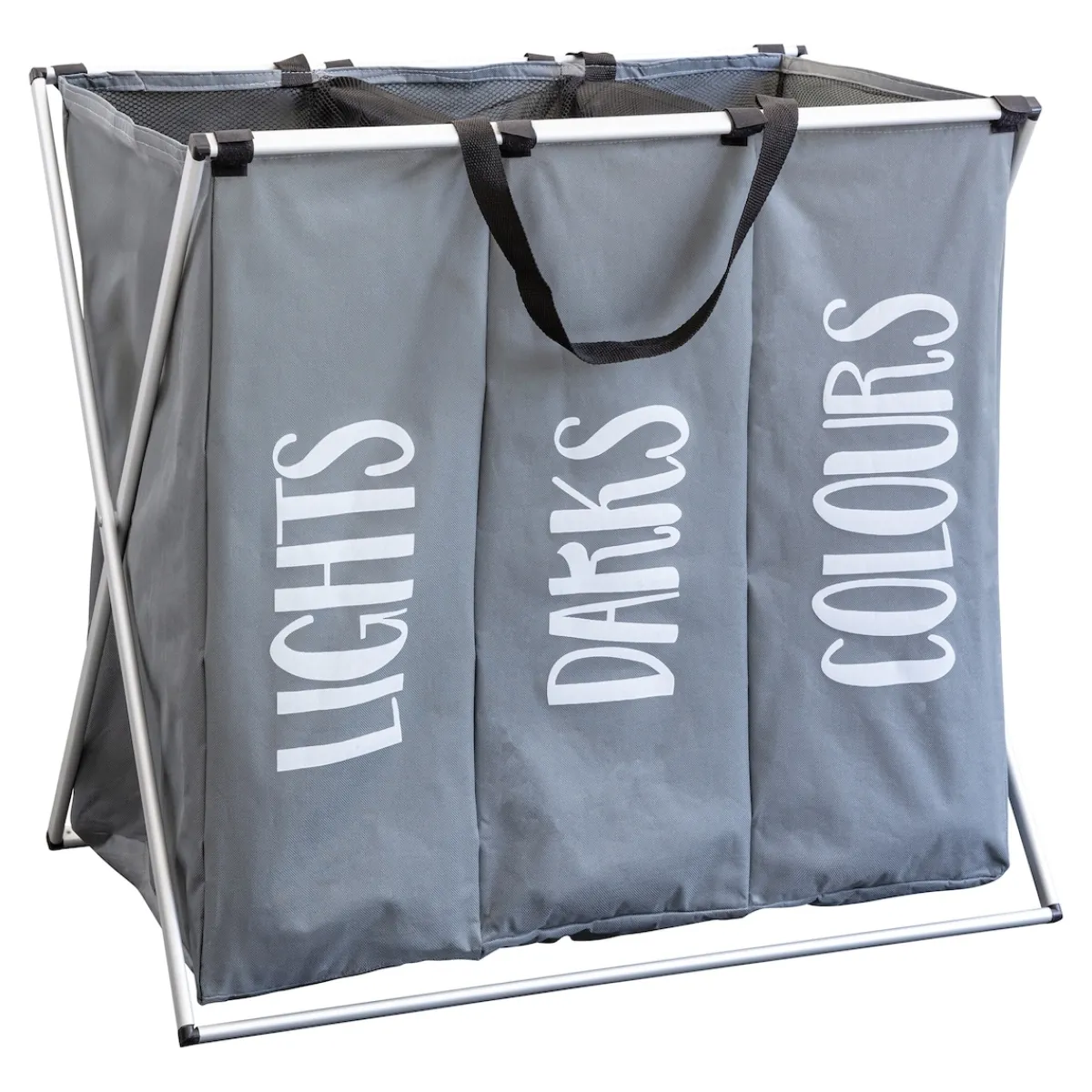 Dieser praktische, platzsparende Sammler mit 3 geräumigen Wäschenetzen erleichtert Ihnen die Hausarbeit: Einfach die getragene Wäsche in das passende Fach für dunkle, helle oder bunte Wäsche einsortieren und in die Waschmaschine geben. Die Netze sind mit Zugverschluss verschließbar, von der Halterung abnehmbar und können problemlos mitgewaschen werden.